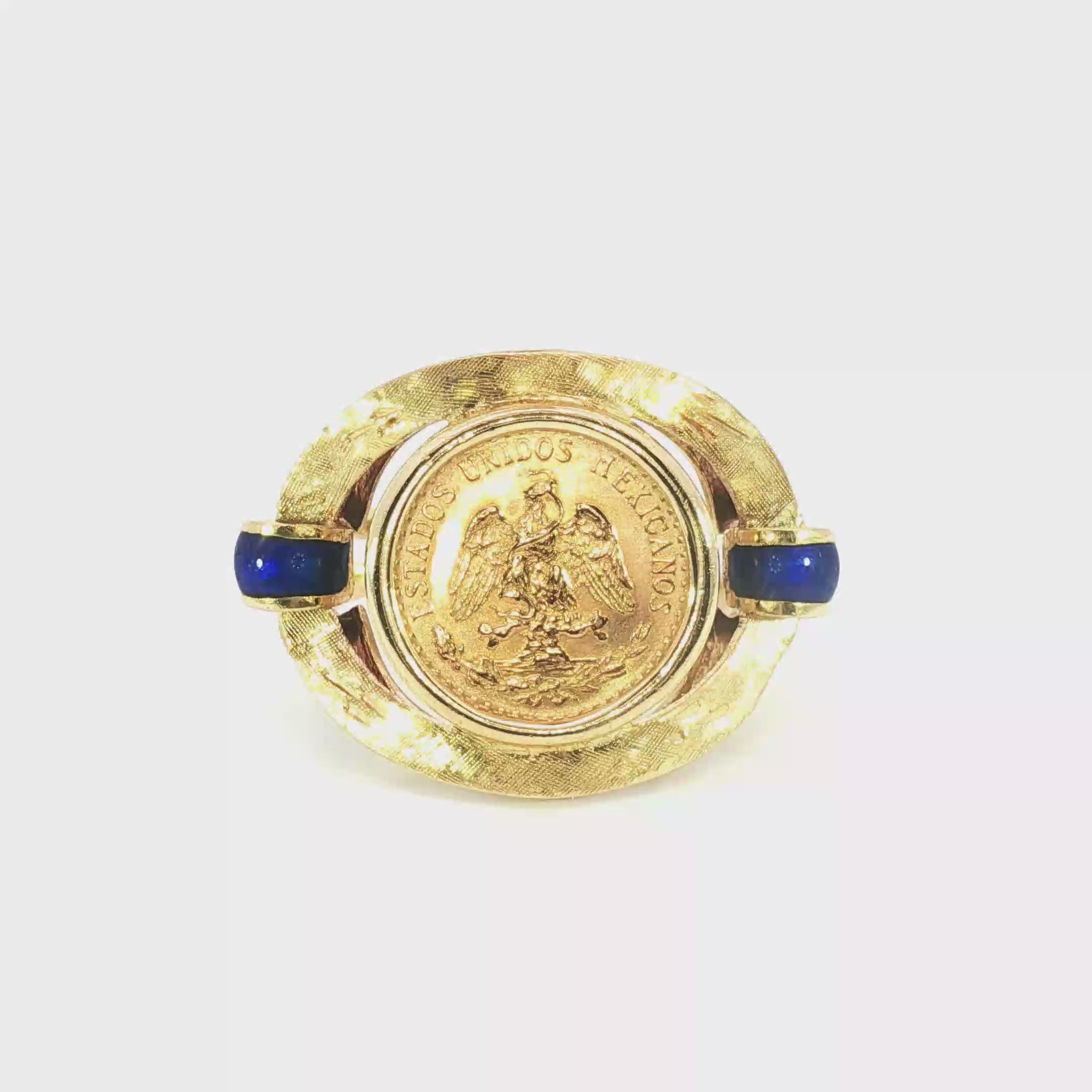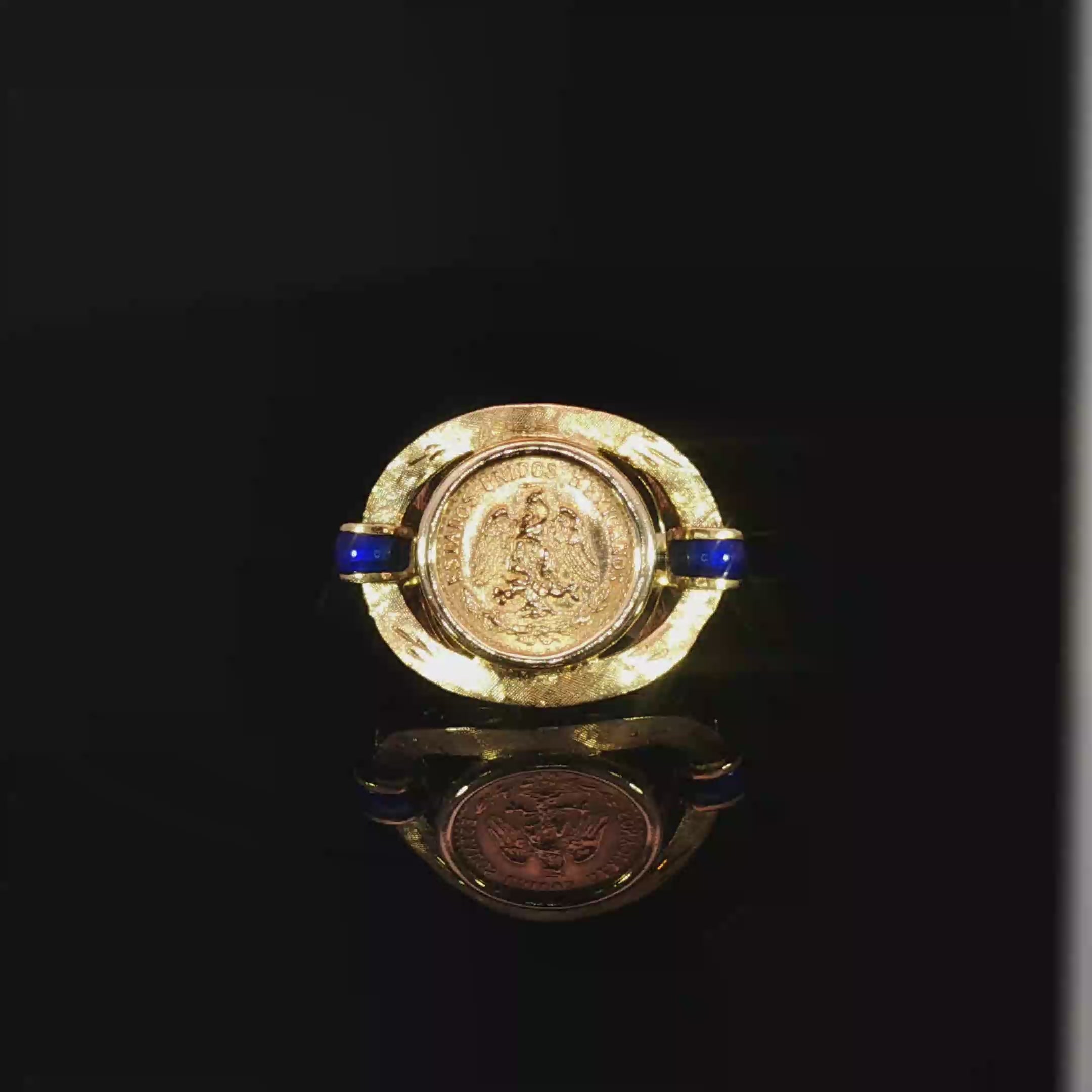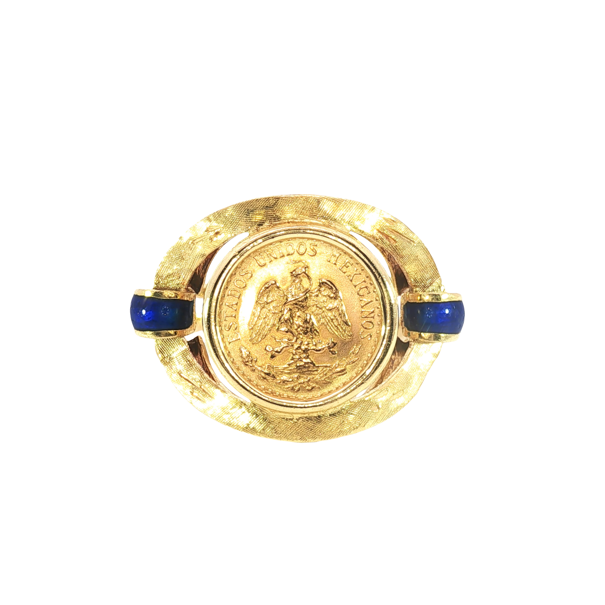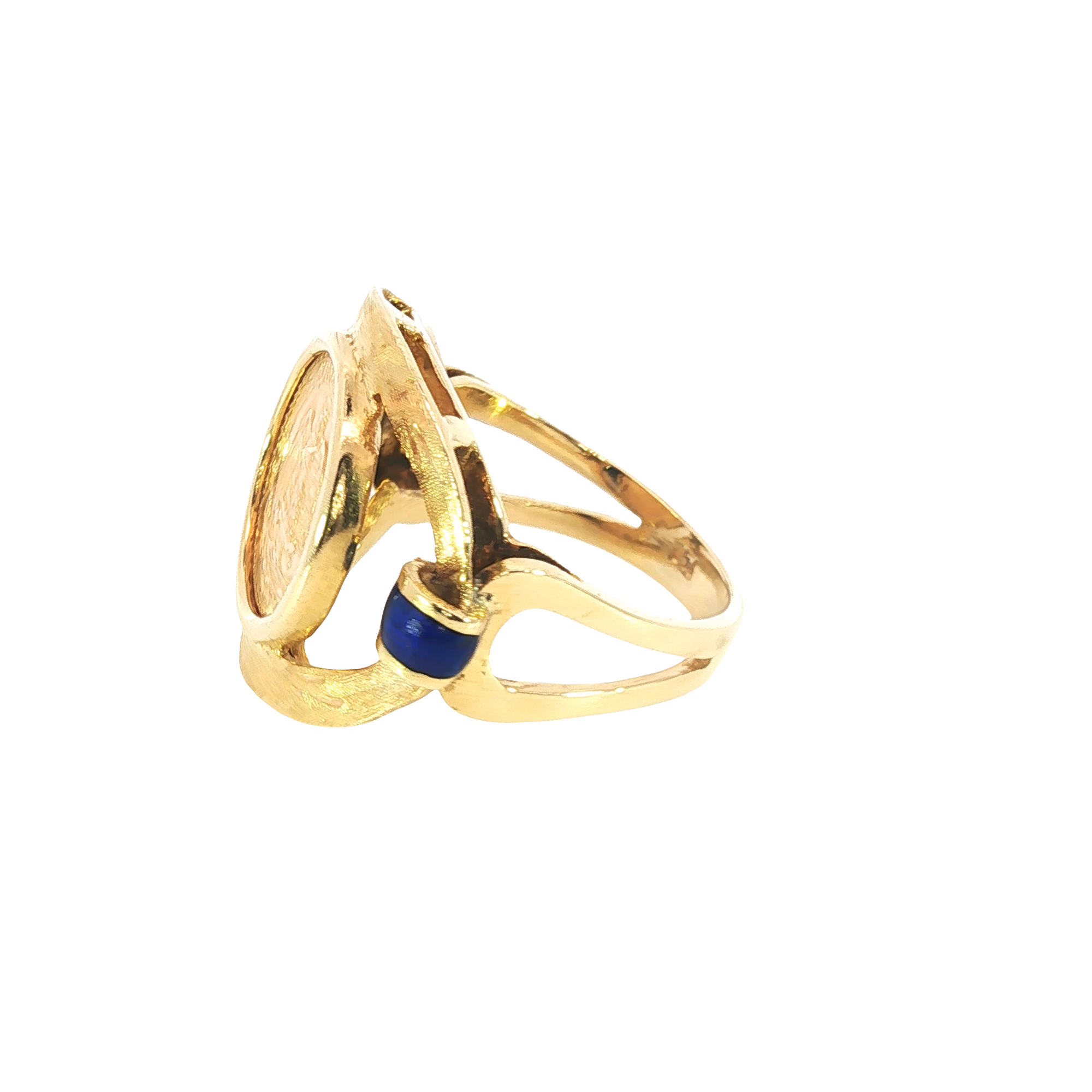 18K Yellow Gold Coin Ring with Blue Enamel Accents