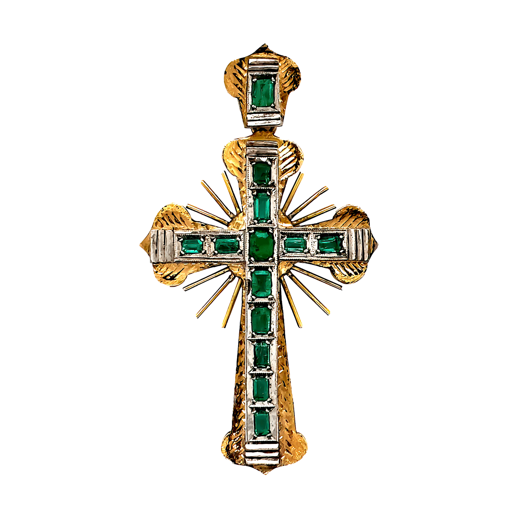 The Platinum & 18K Yellow Gold Emerald Cross is a stunning piece of art that celebrates reverence and elegance. Handmade with meticulous craftsmanship, this two-tone cross features 13 rectangular-shaped Native cut Columbian emeralds, totaling approximately 1.33 carats. This reverent work of art could have been crafted as early as the 1790's, It will add a touch of history to your collection. With its versatile design, this large cross measuring 2.5 x 1.5 inches long can be worn as a pendant or necklace, making it a timeless and cherished accessory for any occasion.