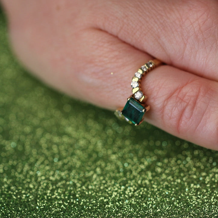 Crafted in rich 18K yellow gold, this striking band showcases a vivid 1 carat natural emerald as its centerpiece. The lush green gem is beautifully enhanced by 10 full cut diamonds along the band, totaling 0.20 carats, adding brilliance and sparkle with every movement. The combination of vibrant emerald and radiant diamonds creates a sophisticated yet versatile design, perfect for making a statement of elegance and style, whether worn every day or reserved for special occasions.