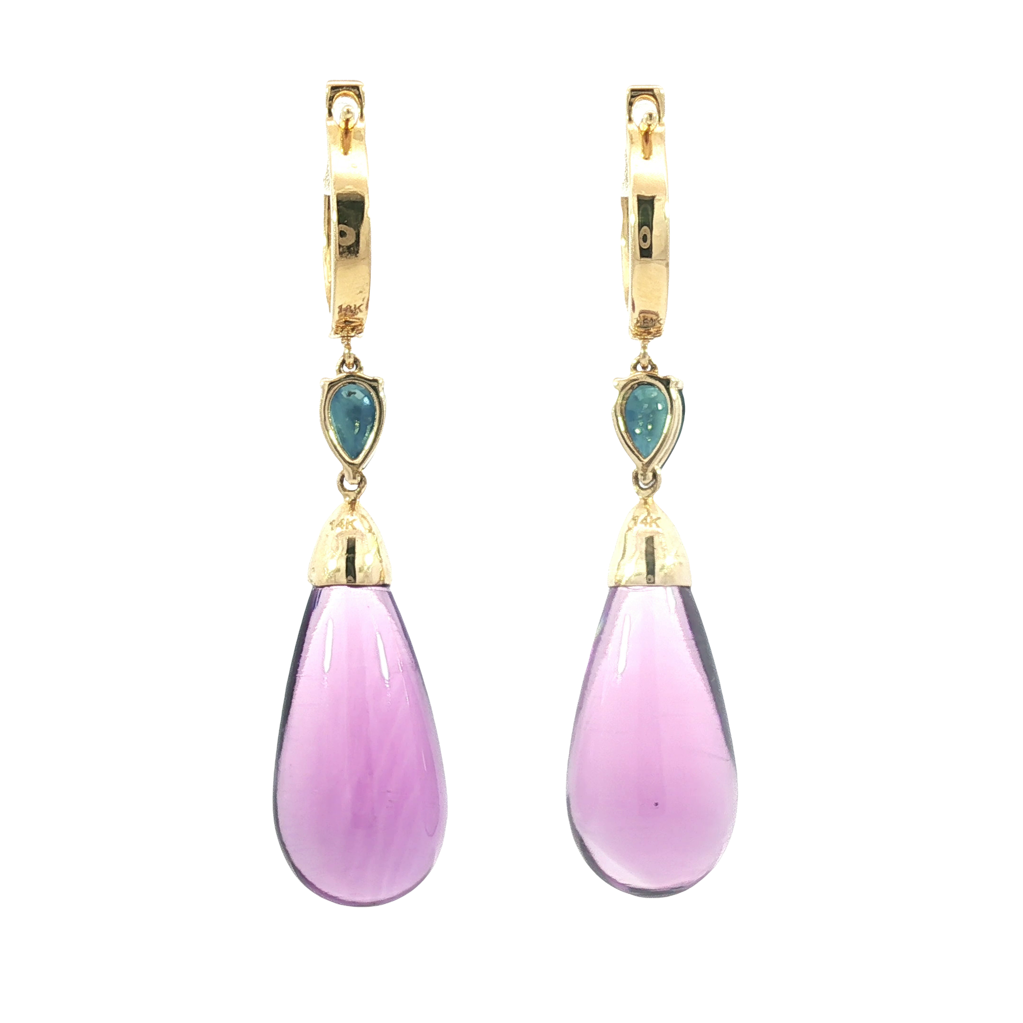 Elevate your style with these exquisite drop earrings, crafted in lustrous 18K yellow gold. Each earring features a captivating pear-shaped amethyst cabochon, exuding a rich purple hue. The amethyst showcases excellent transparency and a smooth polish. Designed with a secure setting, these earrings are the perfect blend of sophistication and artistry.