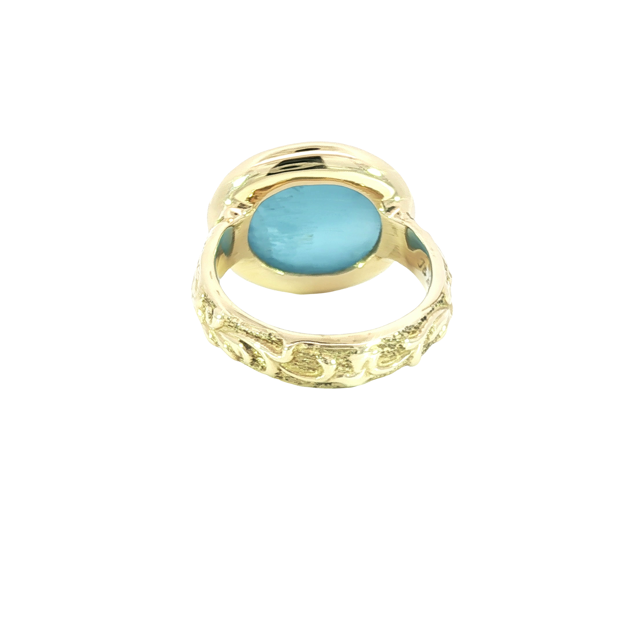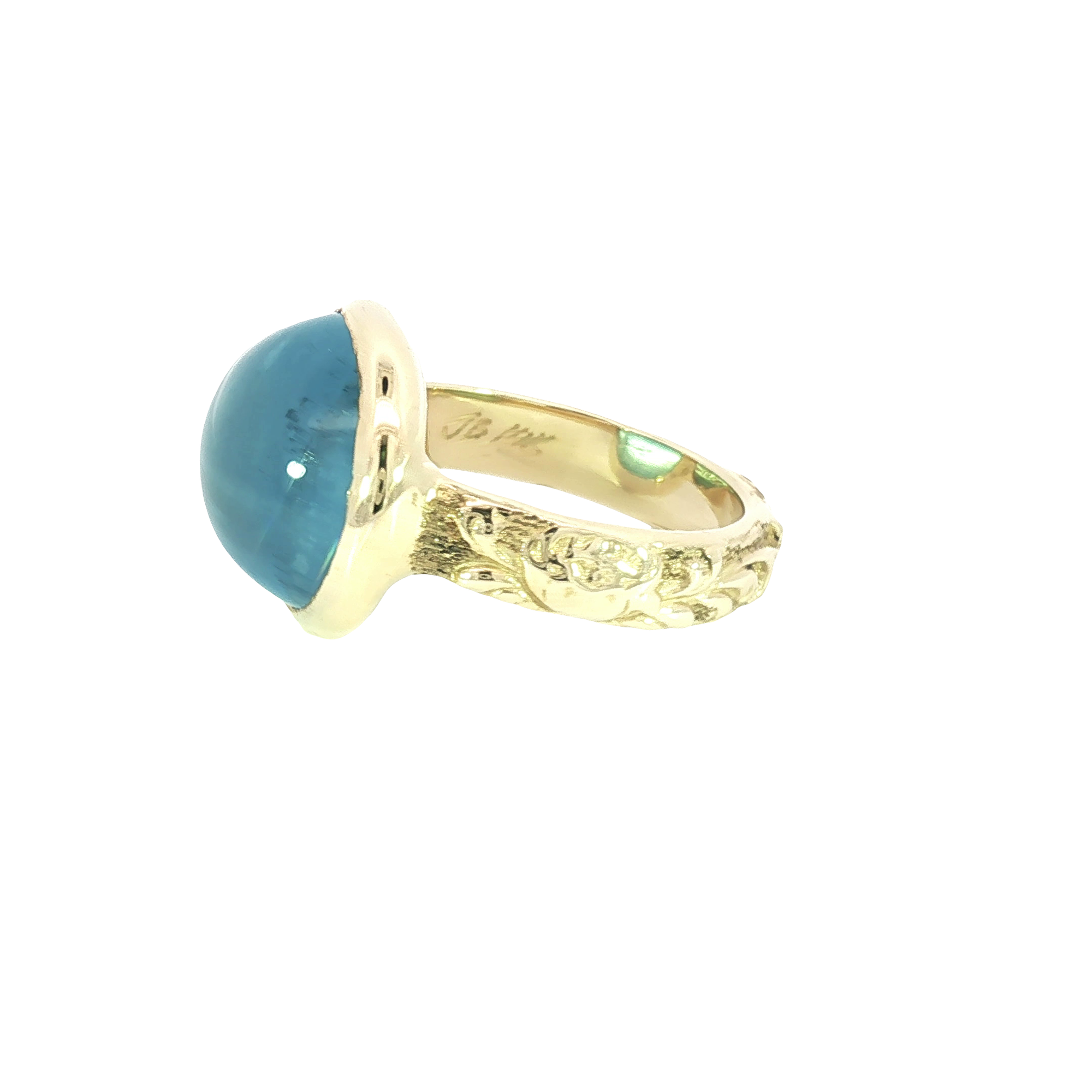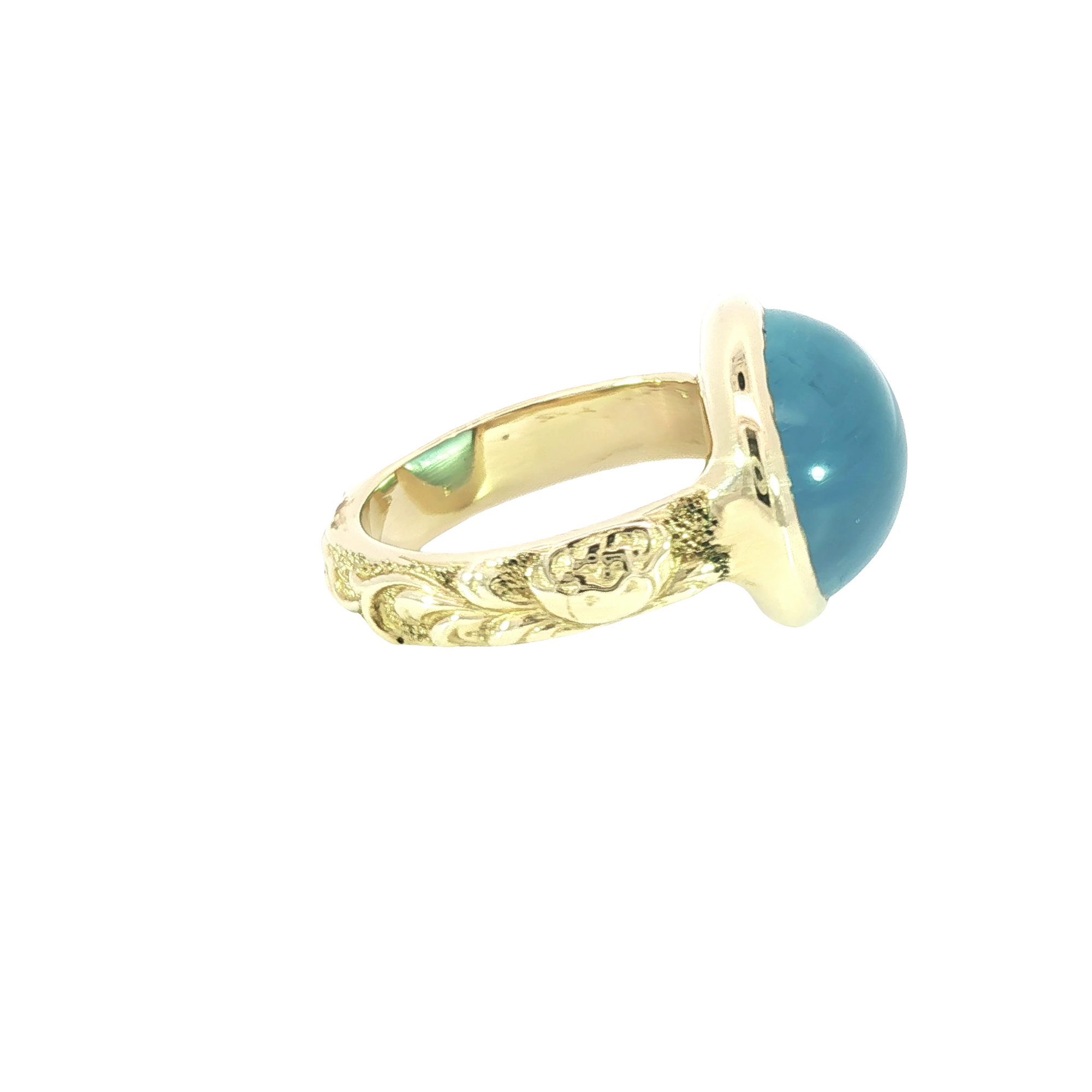 Make a statement with this striking cocktail ring, featuring a mesmerizing bluish green aquamarine gemstone. The aquamarine, shaped into a smooth cabochon, sits elegantly in a 14K yellow gold engraved filigree setting. Perfect for adding a touch of sophistication to any ensemble, this ring showcases a harmonious blend of classic design and vibrant color.