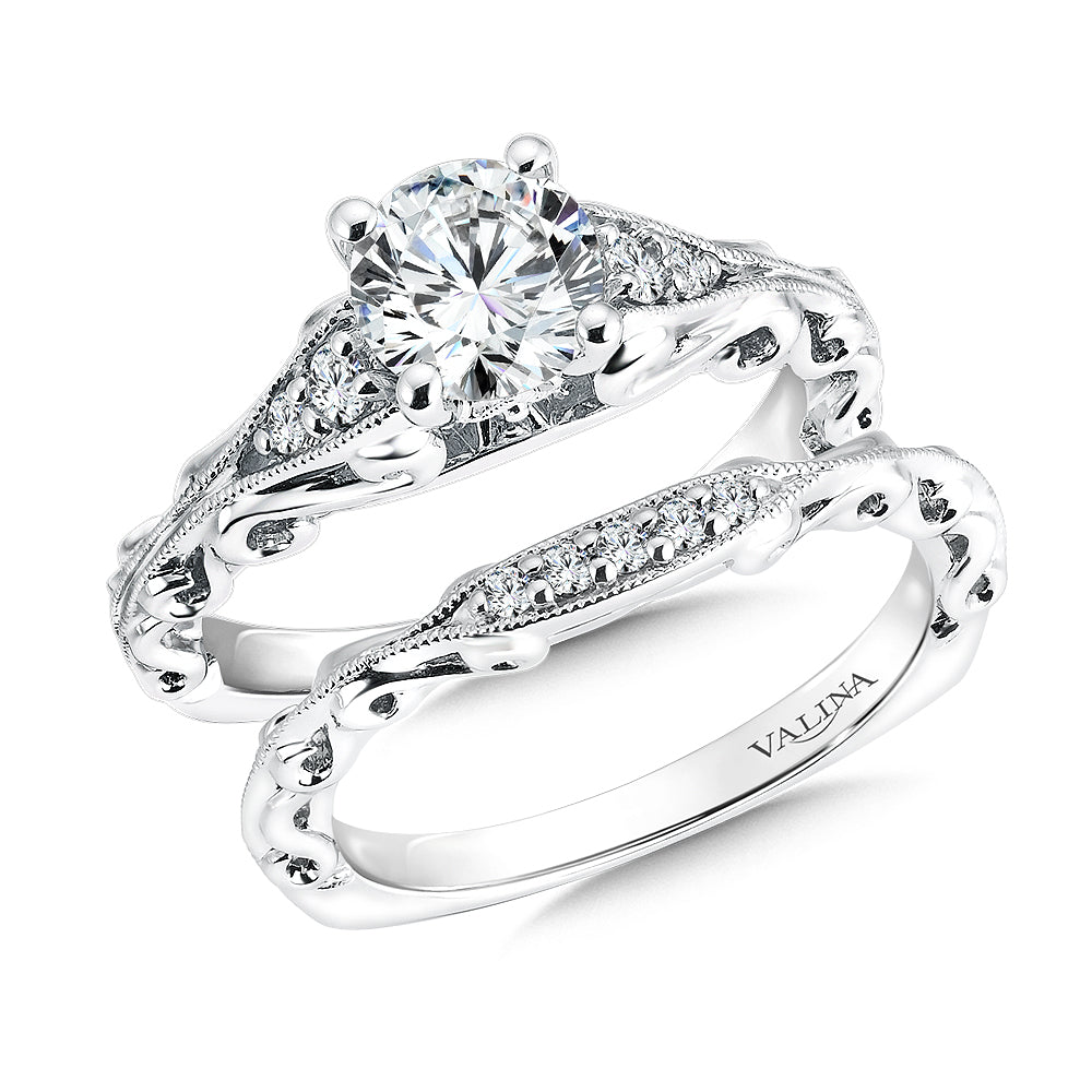 An open scroll design in the ring's profile creates a unique texture on the diamond-accented shoulders. The ring's cathedral shoulders highlight the center stone.
