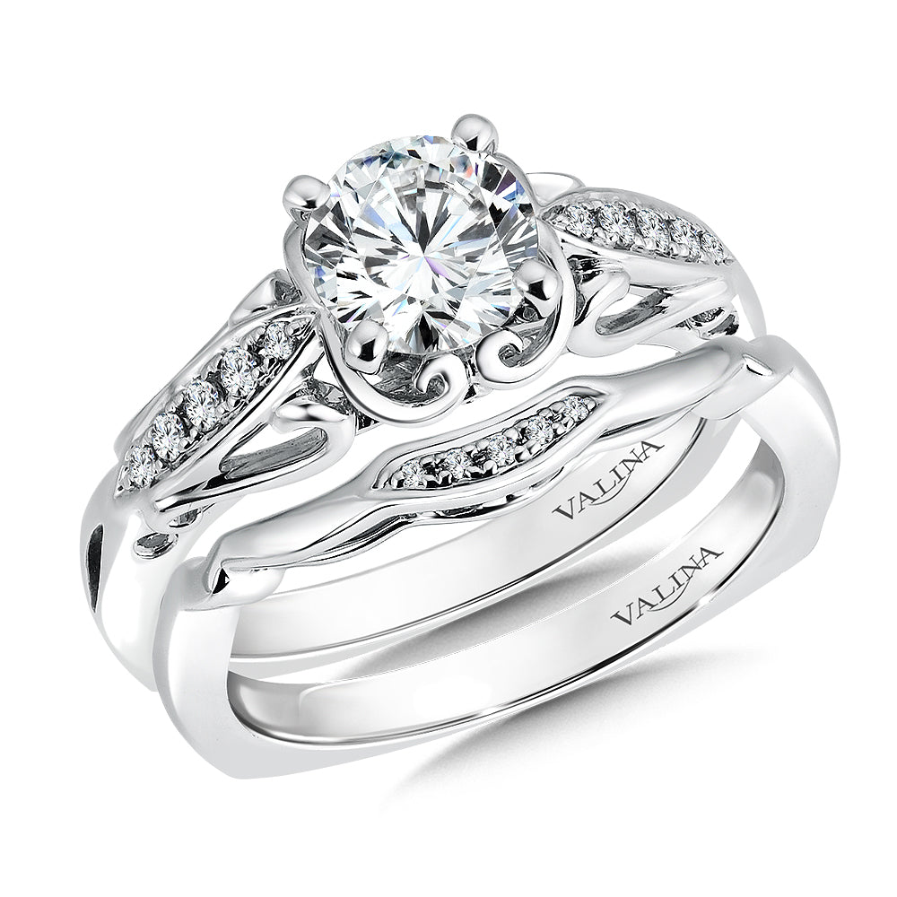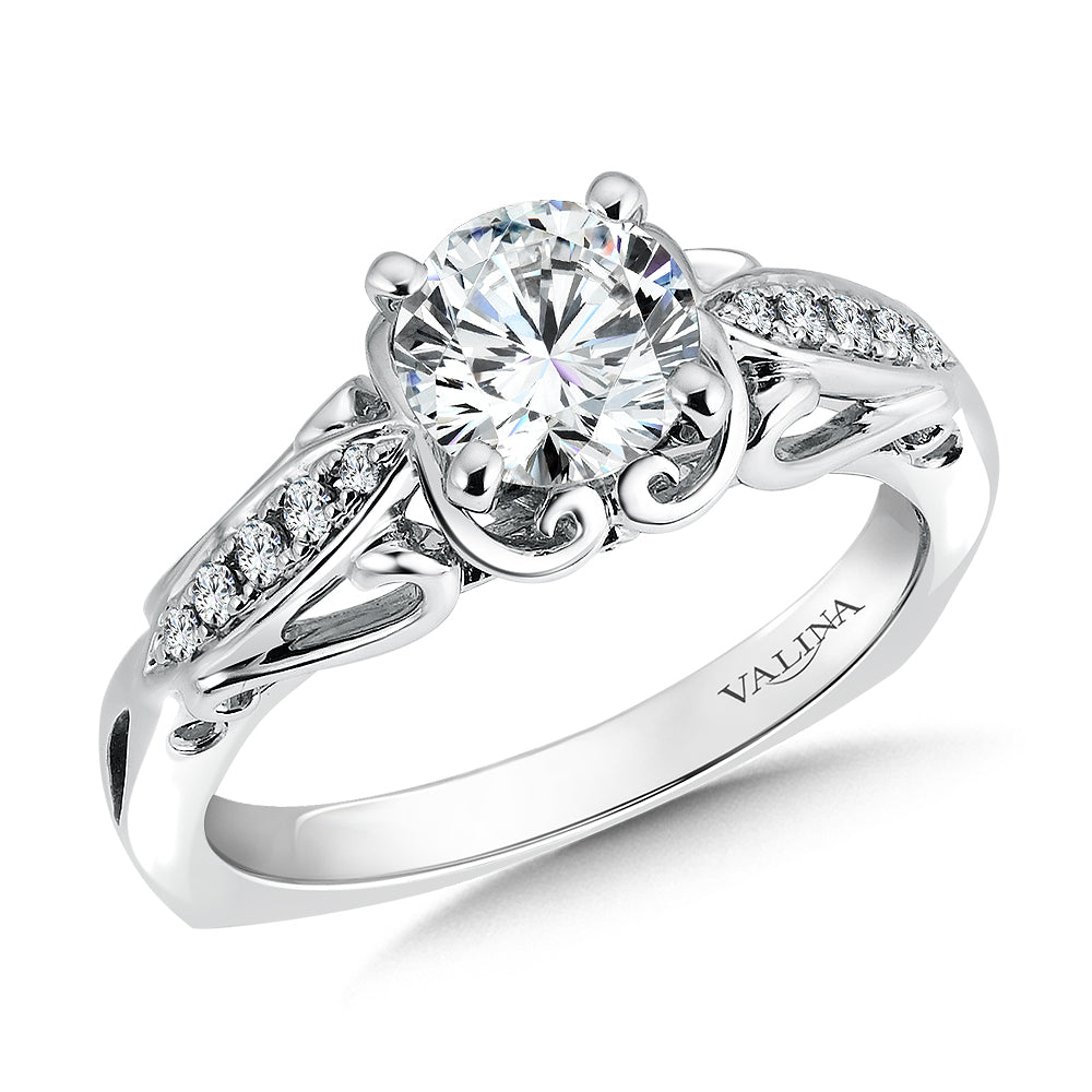An open scroll design in the ring's profile creates a unique texture on the pinched diamond shoulders. The center stone is highlighted by the ring's cathedral shoulders and decorative frame.