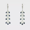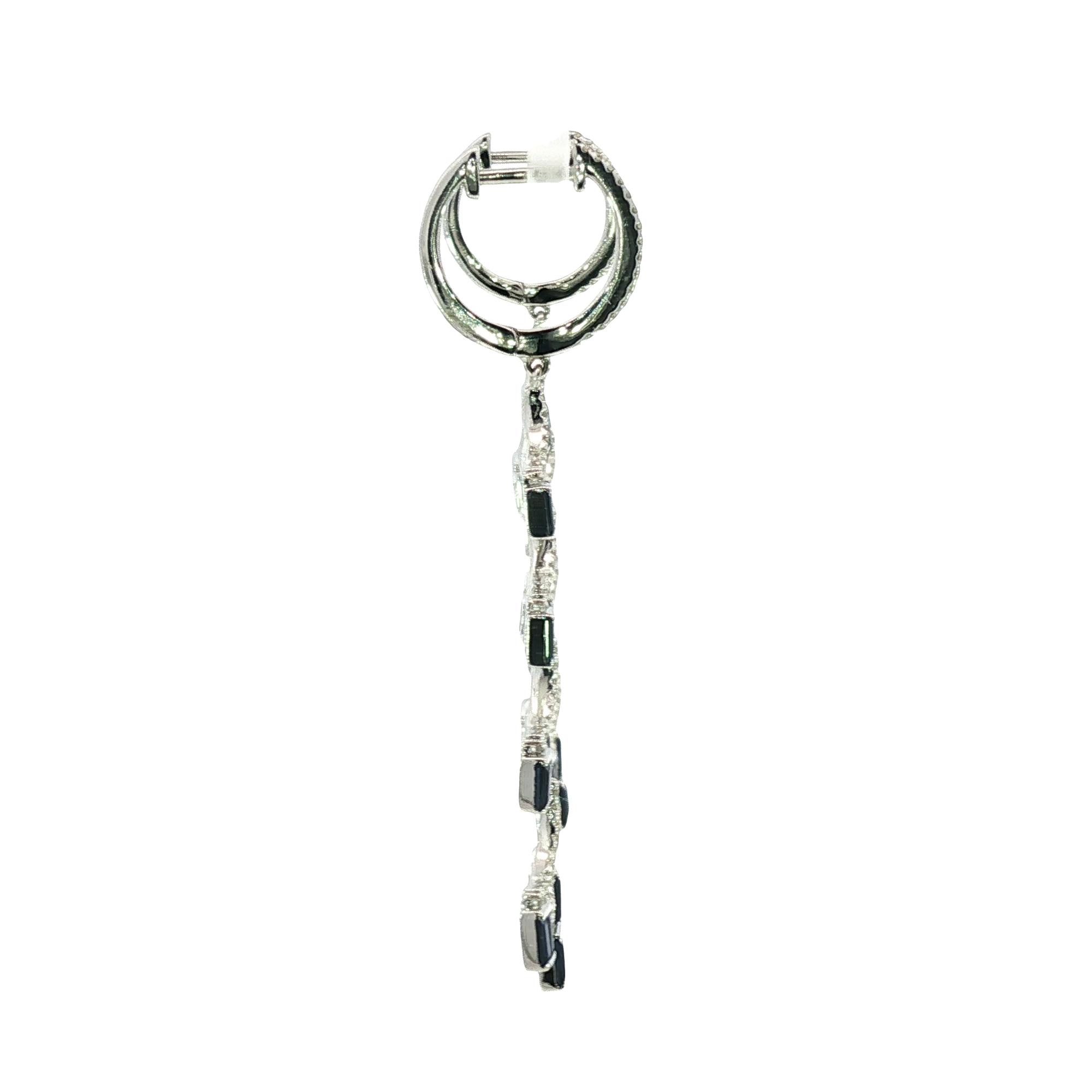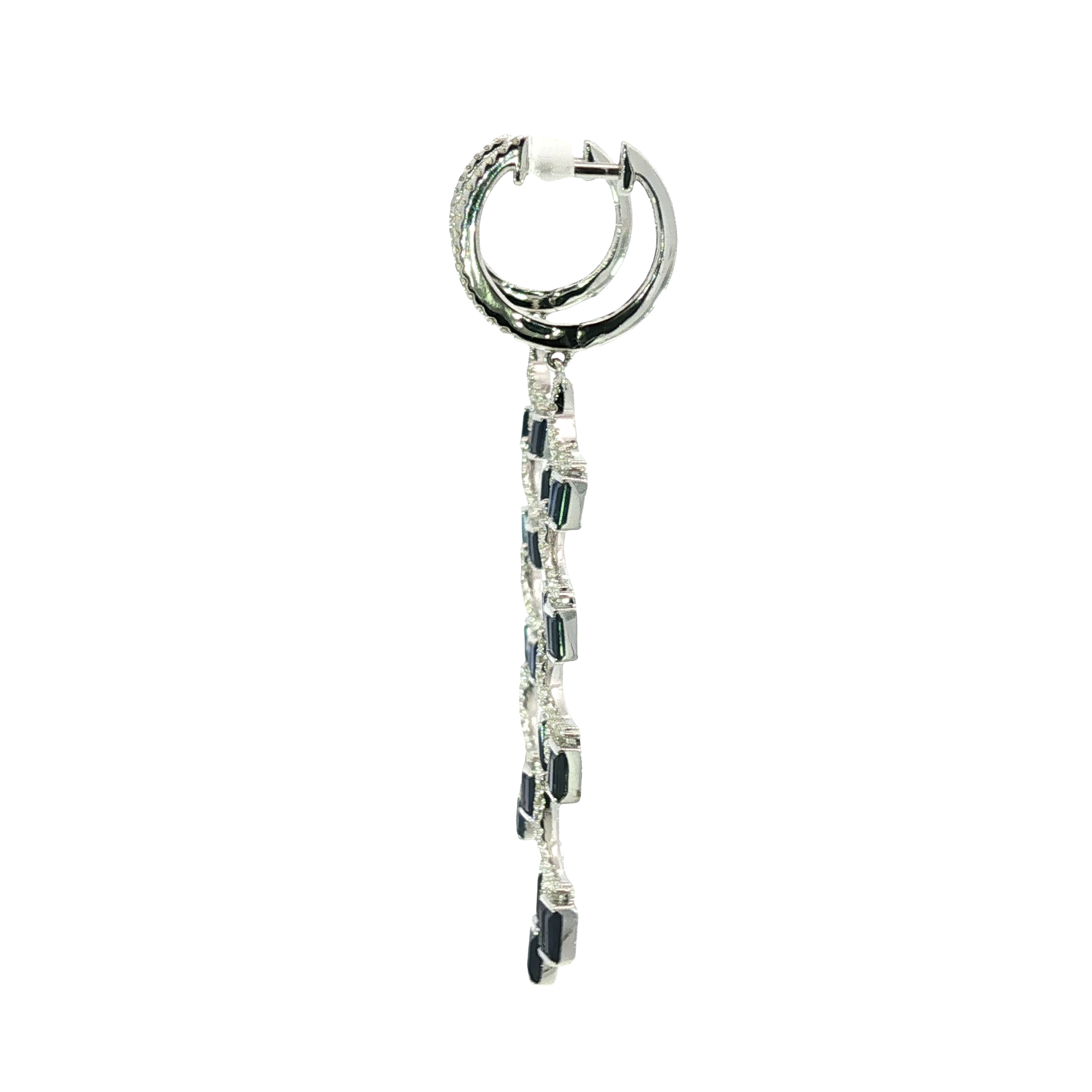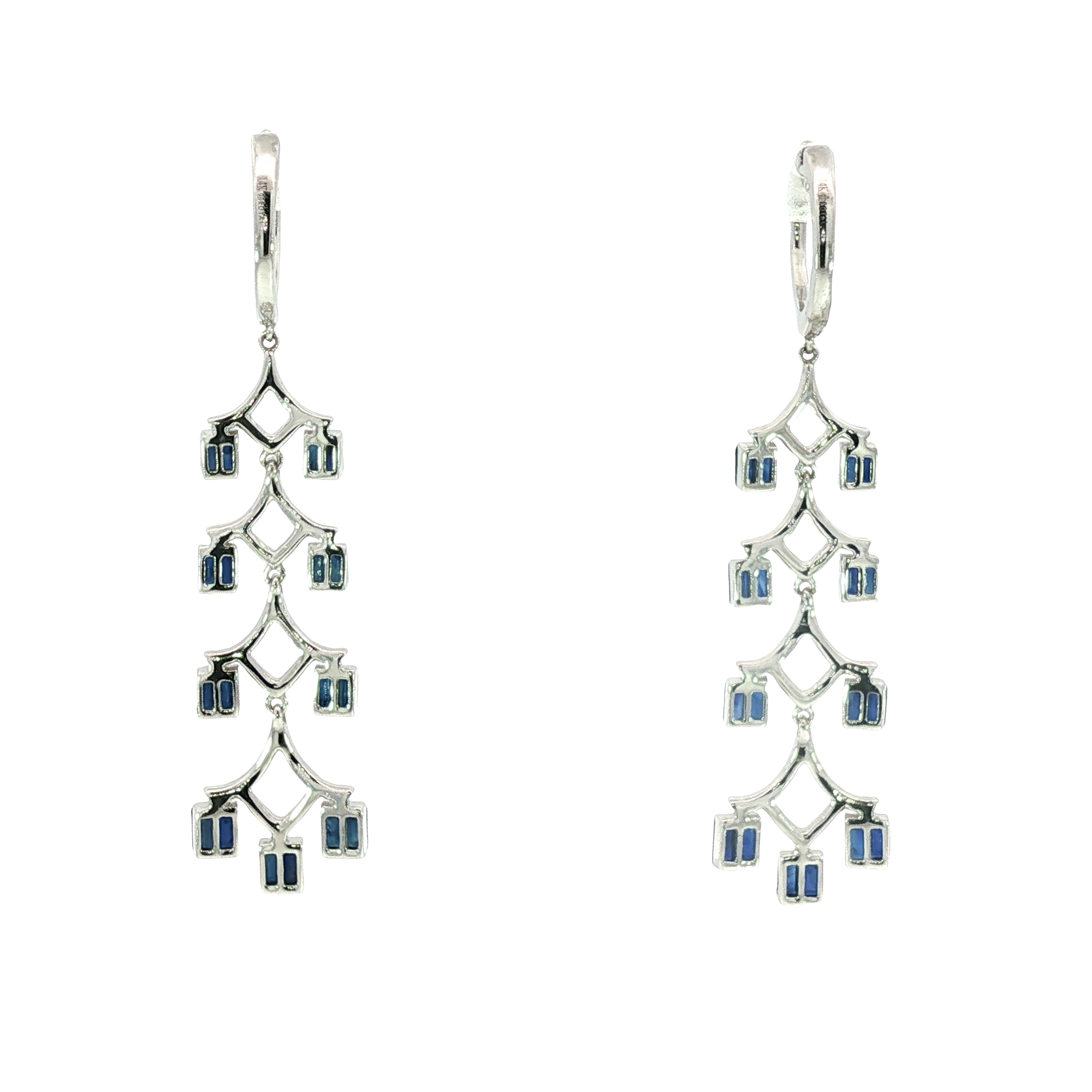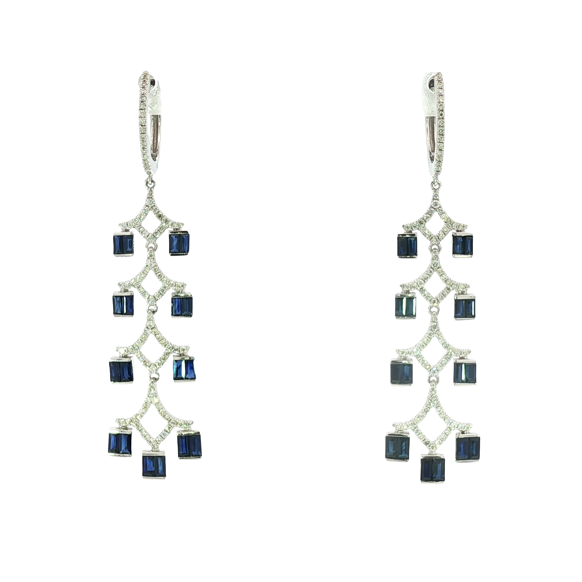 Elegant dangle earrings in a 14K white gold finish. Each earring features a cascade of square step-cut deep blue sapphires and natural diamonds, creating a sophisticated geometric design. The cutting of the sapphires provide good cut grade, polish, and symmetry, allowing for a high level of light performance.
