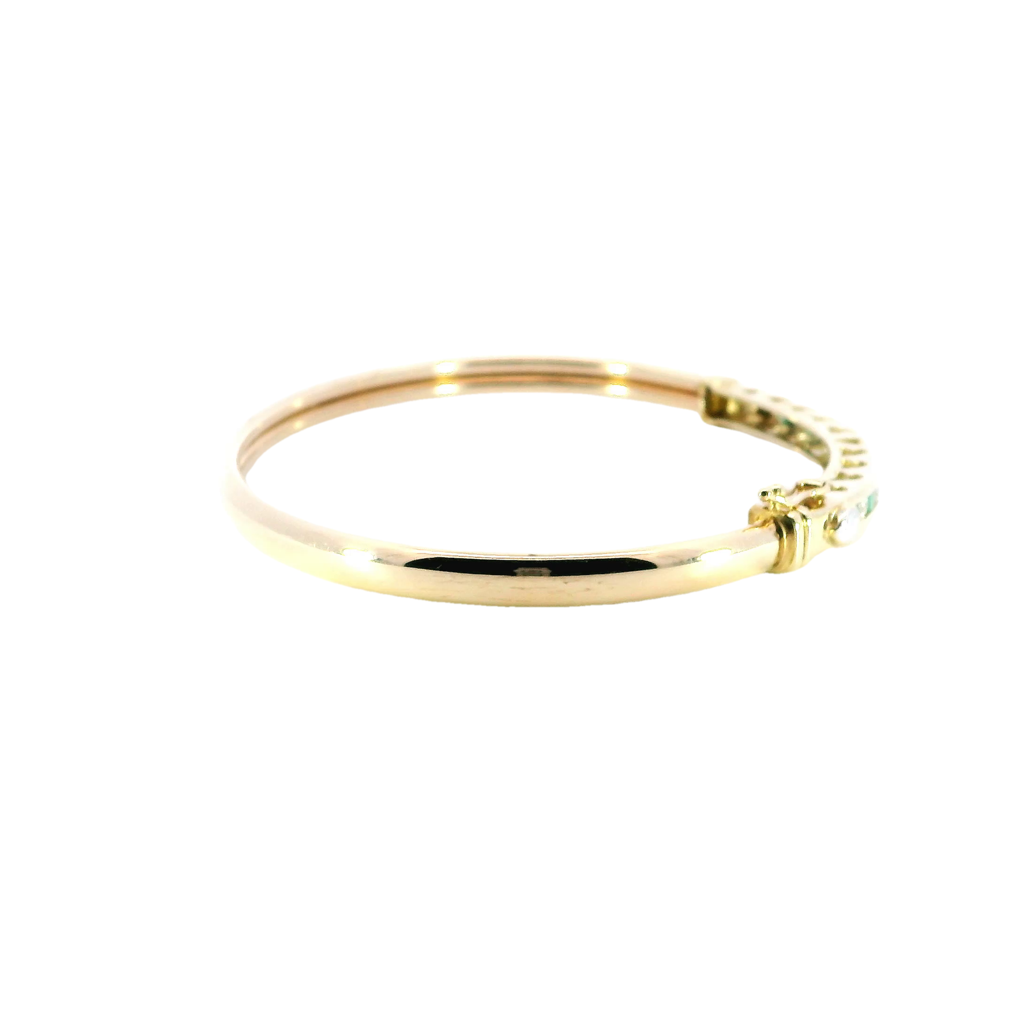 This exquisite gold bracelet features a delicate row of vibrant emerald stones, adding a touch of luxury and sophistication to any outfit. Perfect for special occasions or as an elegant everyday accessory.