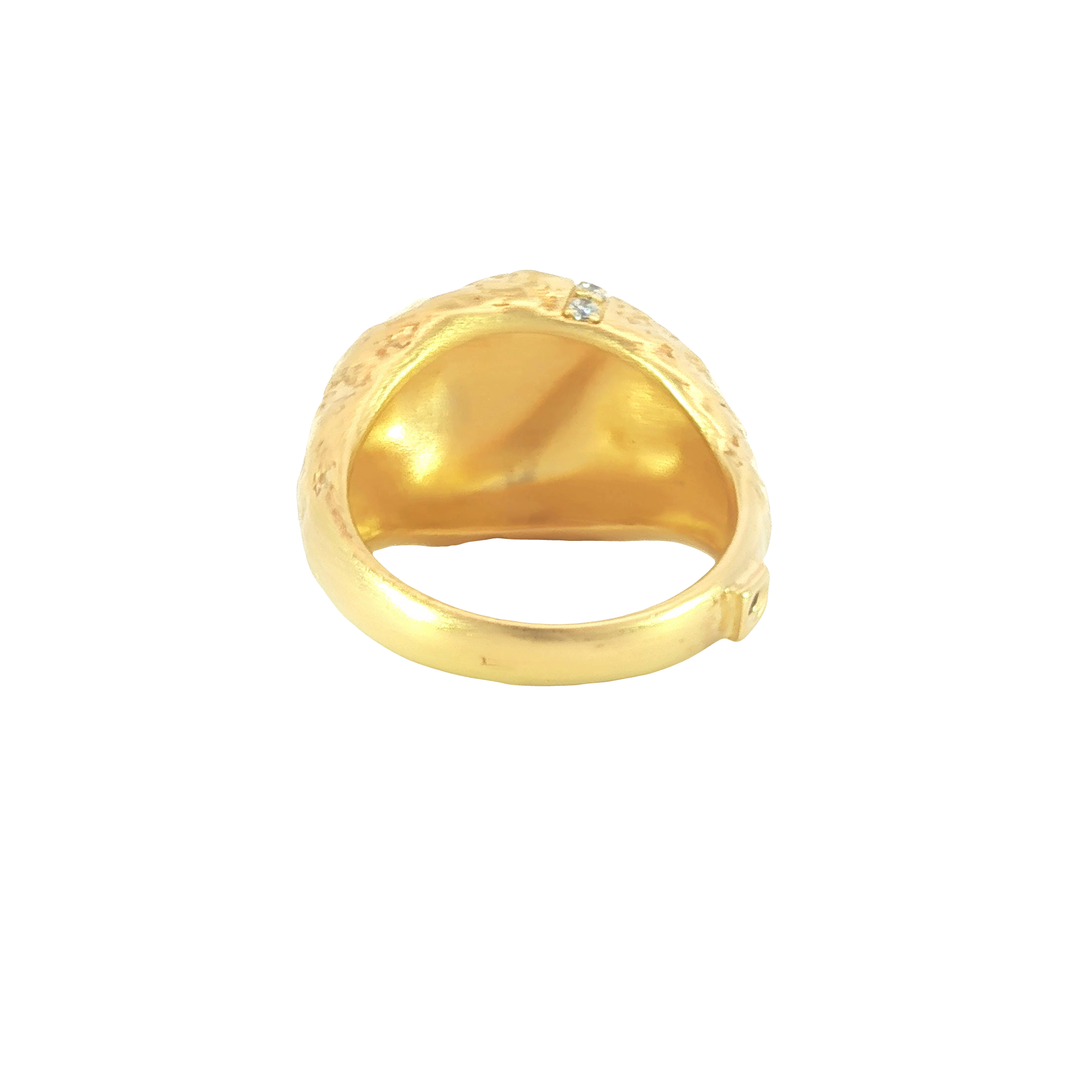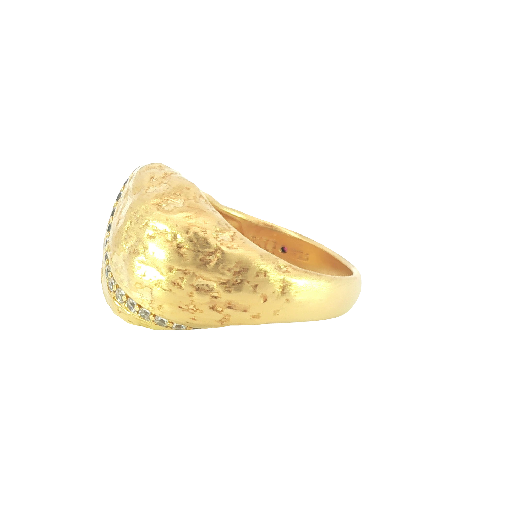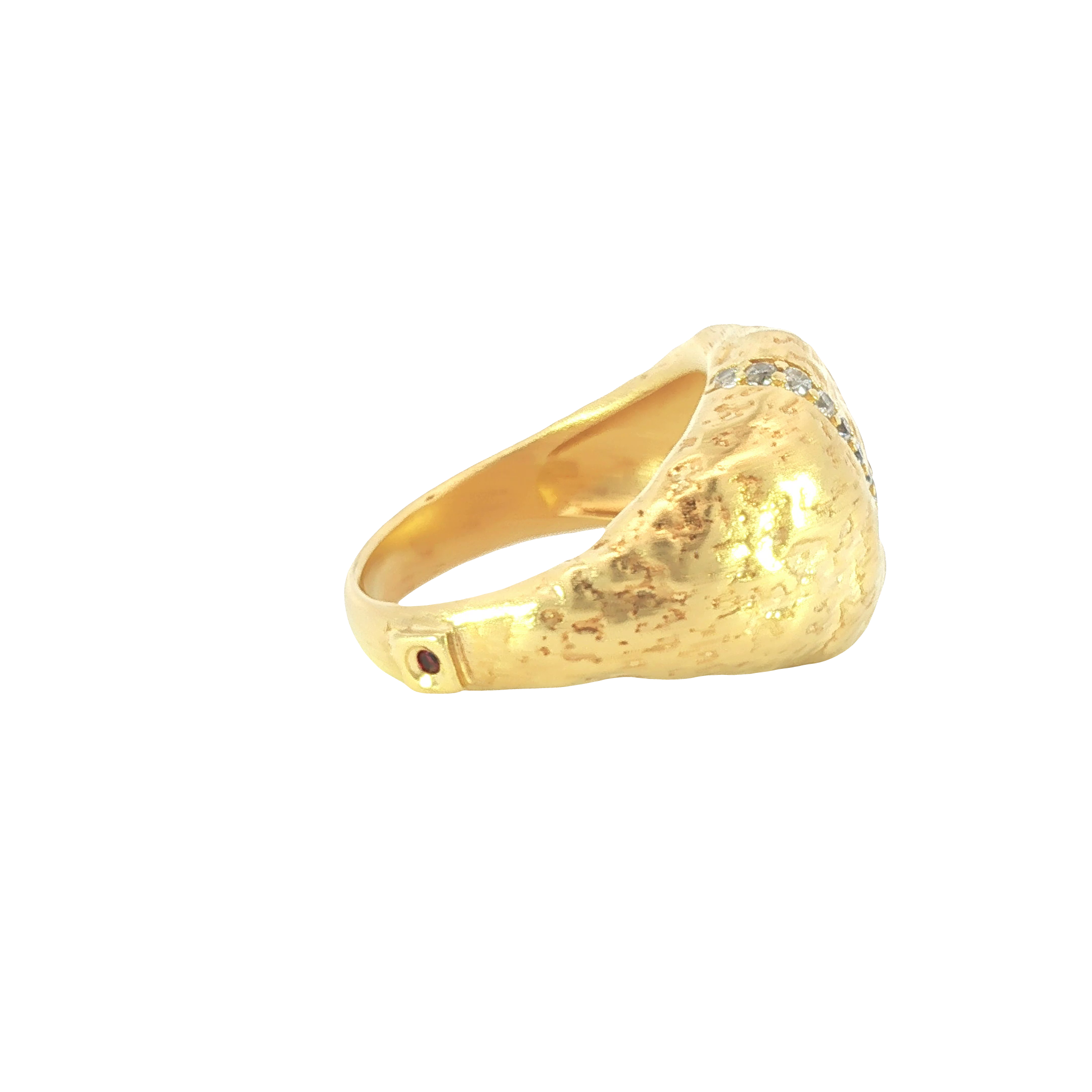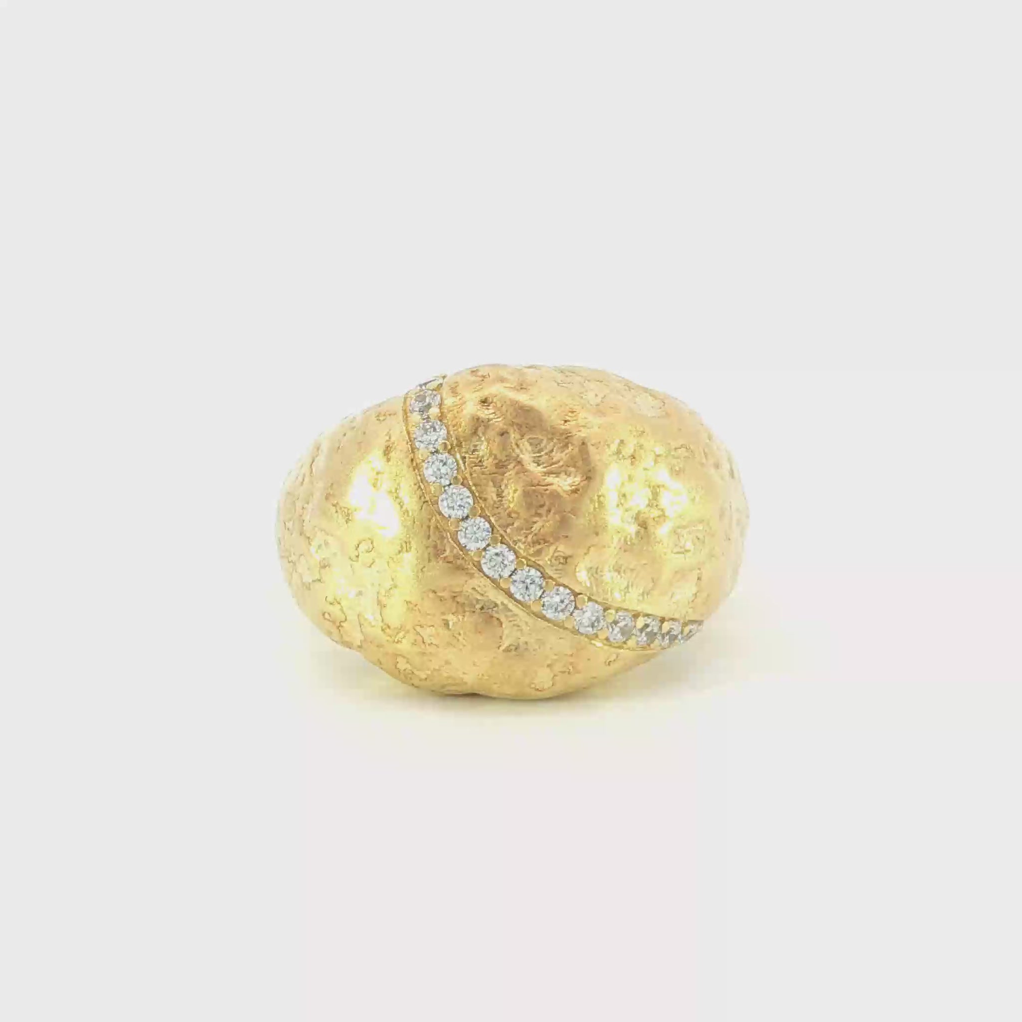 Discover the allure of this stunning gold-plated ring, designed to make a statement. Its unique textured surface is beautifully complemented by a sparkling band of stones, adding a touch of elegance to any outfit. Perfect for both casual and formal occasions, this ring is a must-have accessory for those who appreciate fine jewelry.