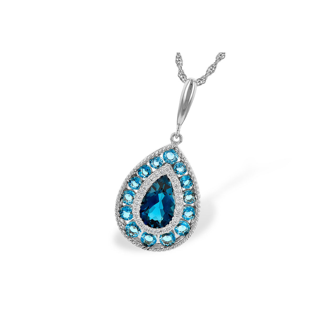 Elevate your style with this exquisite Fancy 14K White Gold Blue Topaz Double Halo Pendant. Crafted with precision and attention to detail, this pendant showcases a captivating pear-shaped London blue topaz at its center, outlined by a row of diamonds for a touch of sparkle. The diamonds, with a total carat weight of .10 carats, are of G color and SI1-2 clarity, ensuring a brilliant and eye-catching display. The pendant is further enhanced by a halo of round Swiss blue topaz, adding a vibrant and alluring touch to the overall design. The twisted rope edge surrounding the halo adds a unique and intricate element to the pendant, making it a true statement piece. Included with the pendant is an 18-inch twist link chain, perfectly complementing the pendant's design and allowing for easy and comfortable wear. The combination of the white gold, blue topaz, diamonds, and intricate detailing make this pendant a timeless and elegant addition to any jewelry collection. Whether worn for a special occasion or as an everyday accessory, this Fancy 14K White Gold Blue Topaz Double Halo Pendant is sure to turn heads and make a lasting impression.