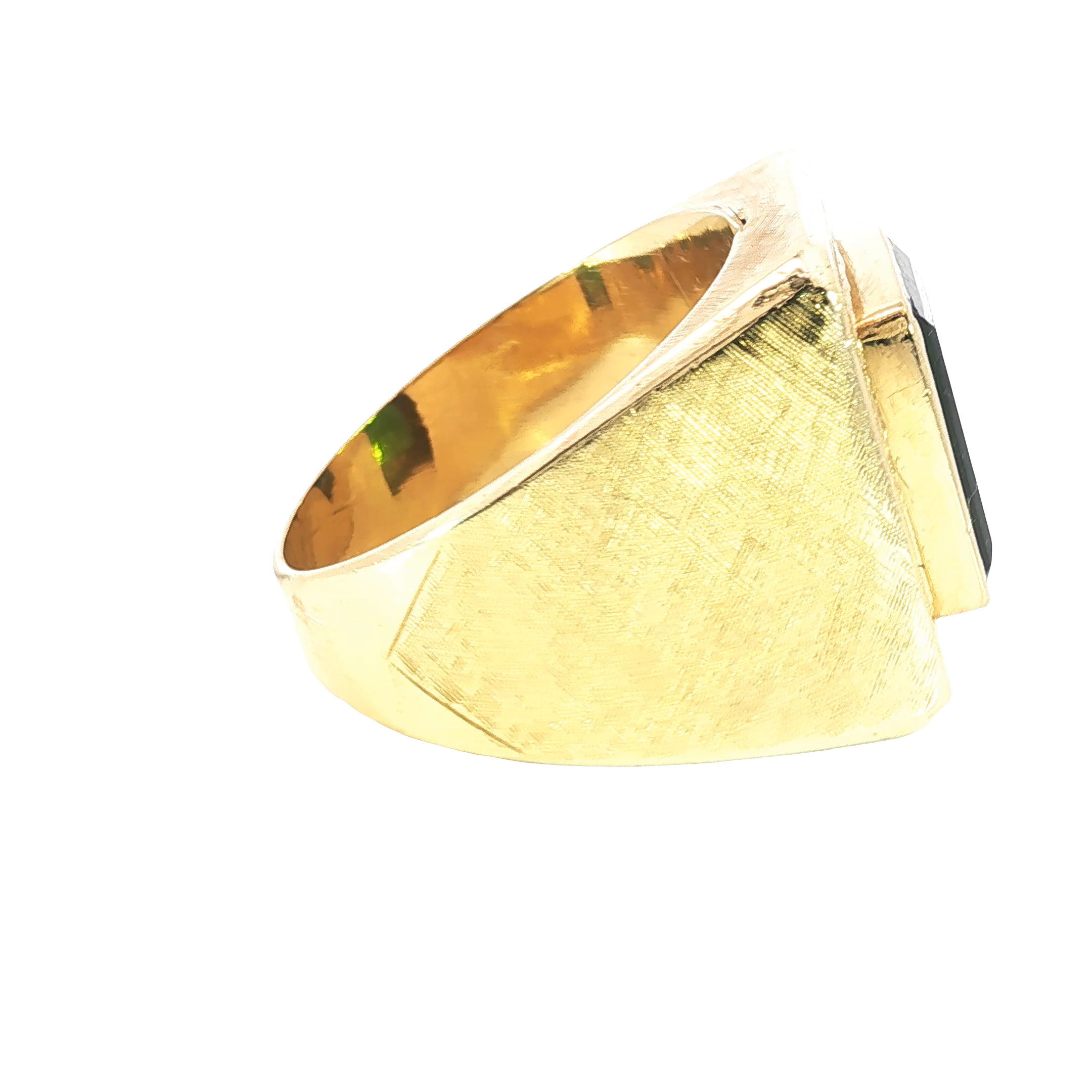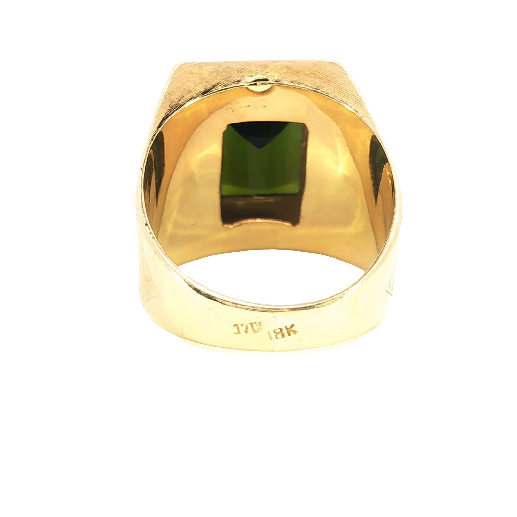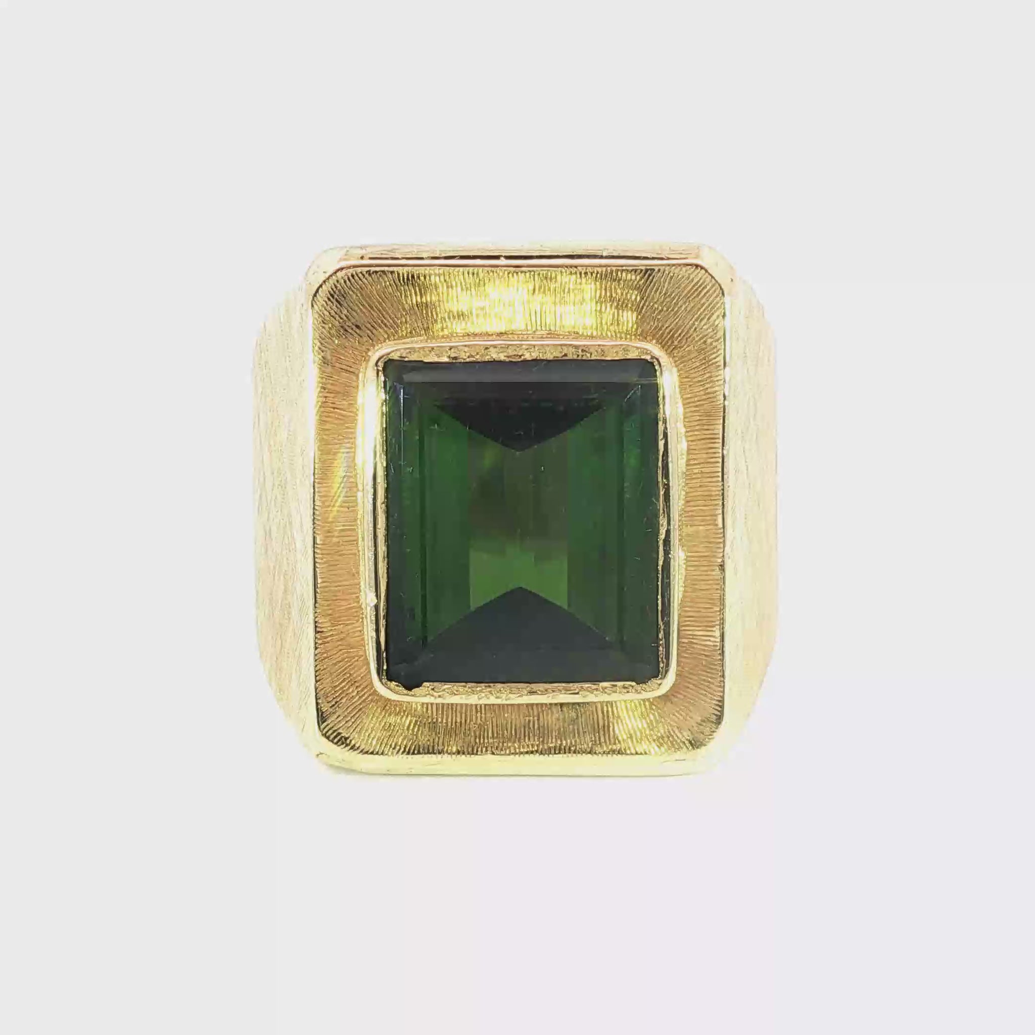 This 18K yellow gold ring features a richly hued green tourmaline as its centerpiece, beautifully set in a textured gold band that adds depth and character. The stone’s distinctive square cut brings a modern edge to a classic silhouette, creating a bold yet refined statement piece perfect for any occasion. Ring size 10.