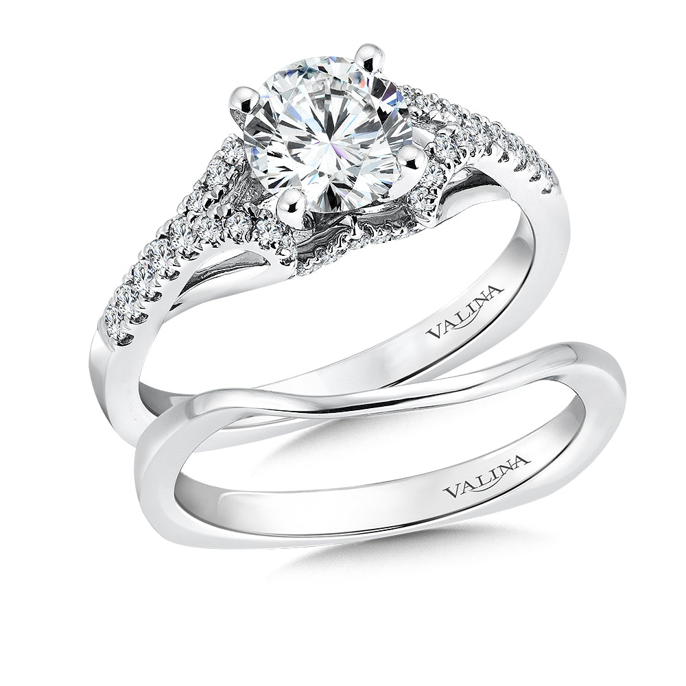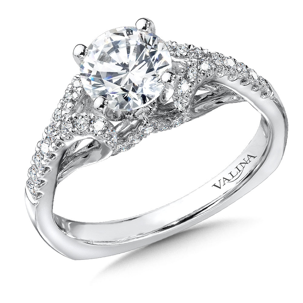 Sparkling diamonds fill the sides of this breathtaking diamond engagement ring. The shank's shoulder curl under, creating a loop design to the profile. The under gallery beneath the head features a curved diamond-accented V-shape that swoops up and merges the head's base. When combined, you get a dazzling diamond design that is sure to make any bride happy for the rest of their life.