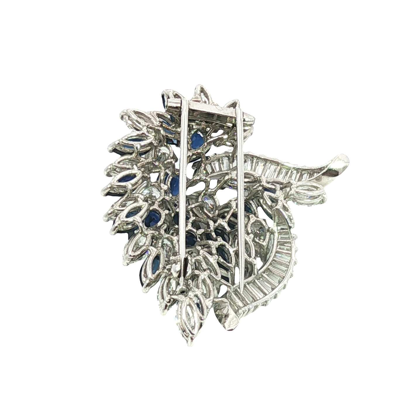 Accenting the sapphires are 6.40 carats of brilliant diamonds in G-H color and VS clarity, including elegant baguette and marquise cuts that add light, movement, and architectural balance to the design. The sweeping platinum framework enhances the contrast between the vivid sapphires and the radiant diamonds, creating a piece of exceptional presence and sophistication. With remarkable symmetry, polish, and meticulous stone placement, this brooch embodies timeless luxury. A statement heirloom designed for collectors who appreciate scale, rarity, and enduring elegance.