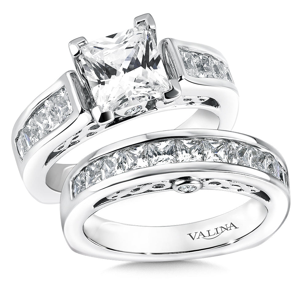 A Princess cut center stone is highlighted by large princess cut diamonds in a bright polished channel setting. A surprise diamond and infinity filigree in the gallery are a delicate touch.