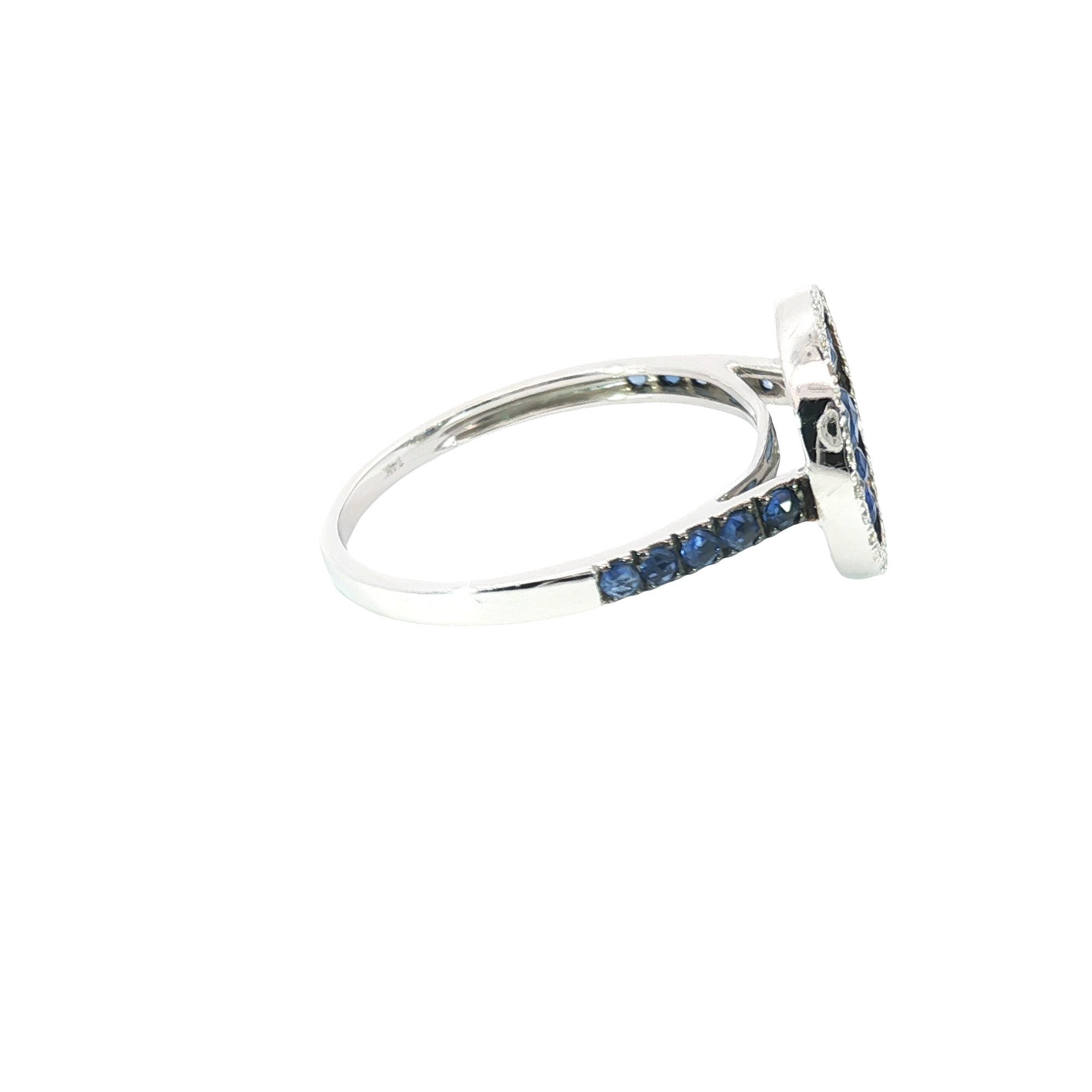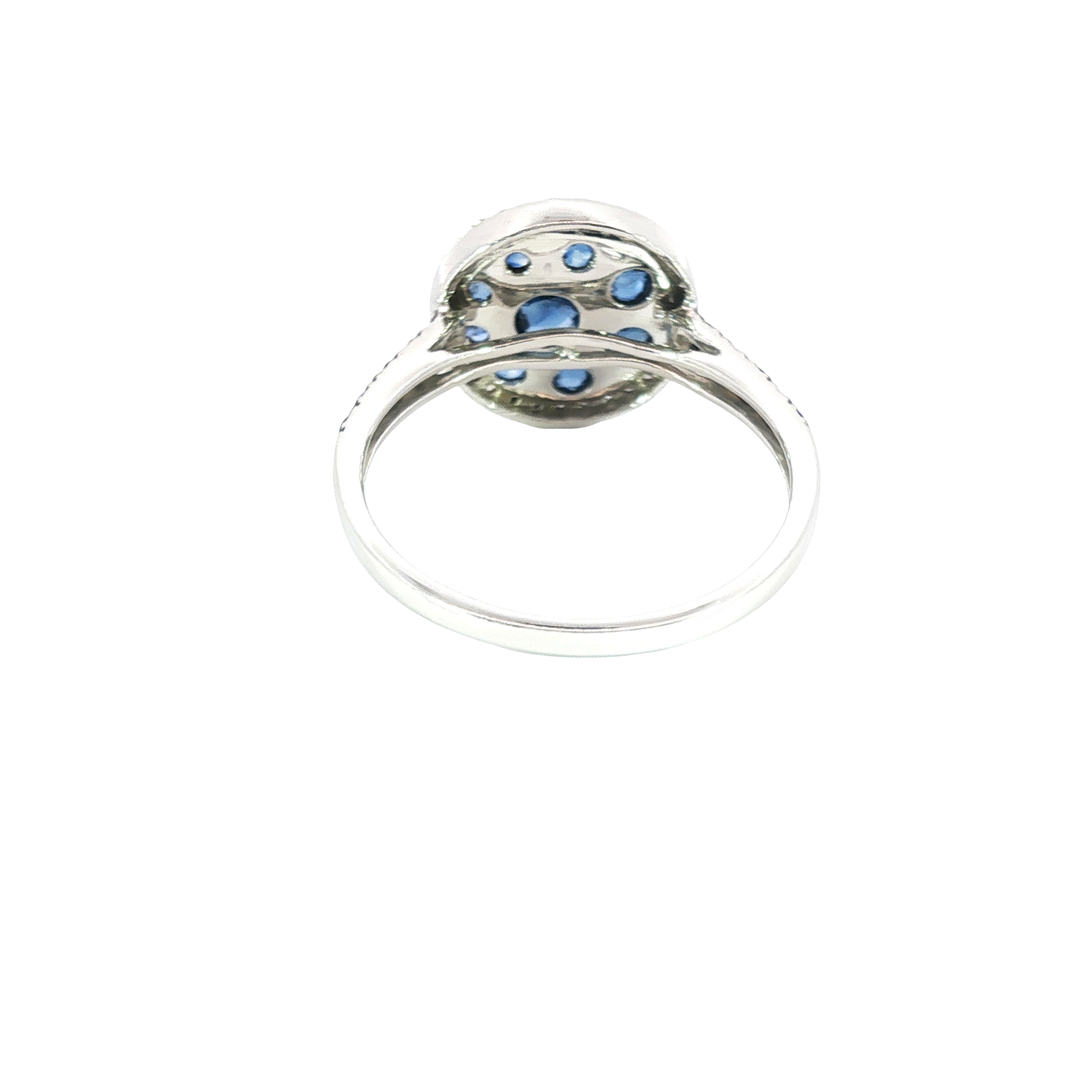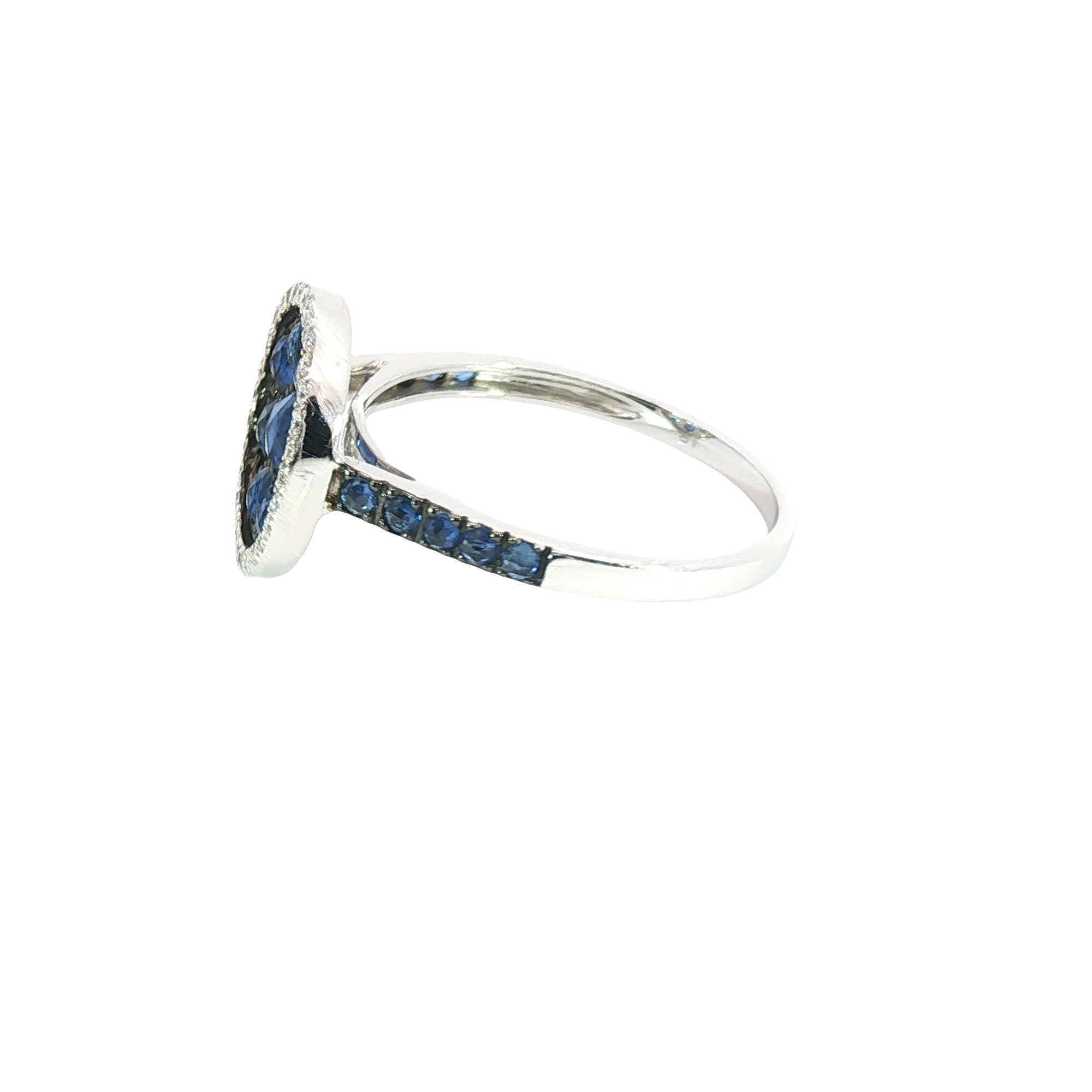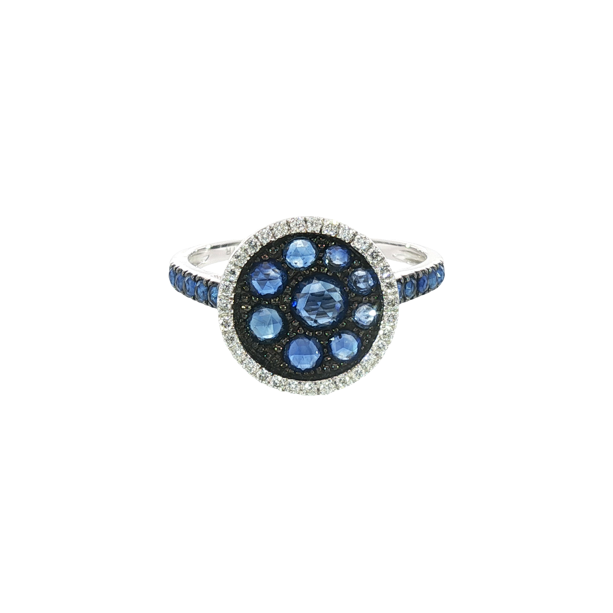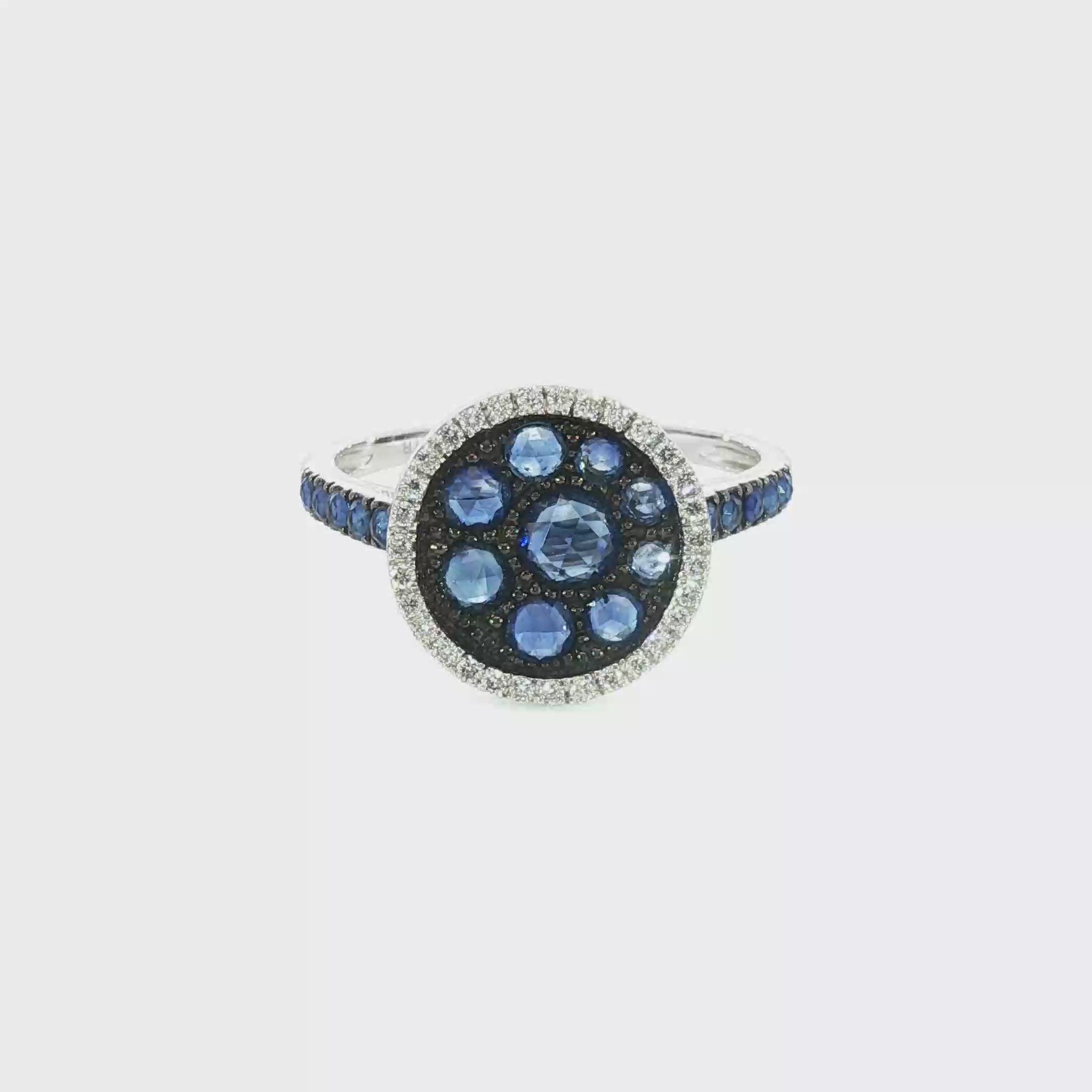 Exquisite ring is crafted in 14K white gold. This statement piece features a central arrangement of rose cut sapphires exhibiting a captivating royal blue hue, set within a dazzling halo on natural diamonds. The shank of the ring has round brilliant cut sapphires running down the shank. The sapphires in this design are surrounded by gold that has been antiqued. The antiqued process is sometimes referred to as "black rhodium". This feature makes the white natural diamonds pop compared to the dark blue of the sapphires next to it. The intricate design and meticulous craftsmanship render this ring a standout addition to any fine jewelry collection.