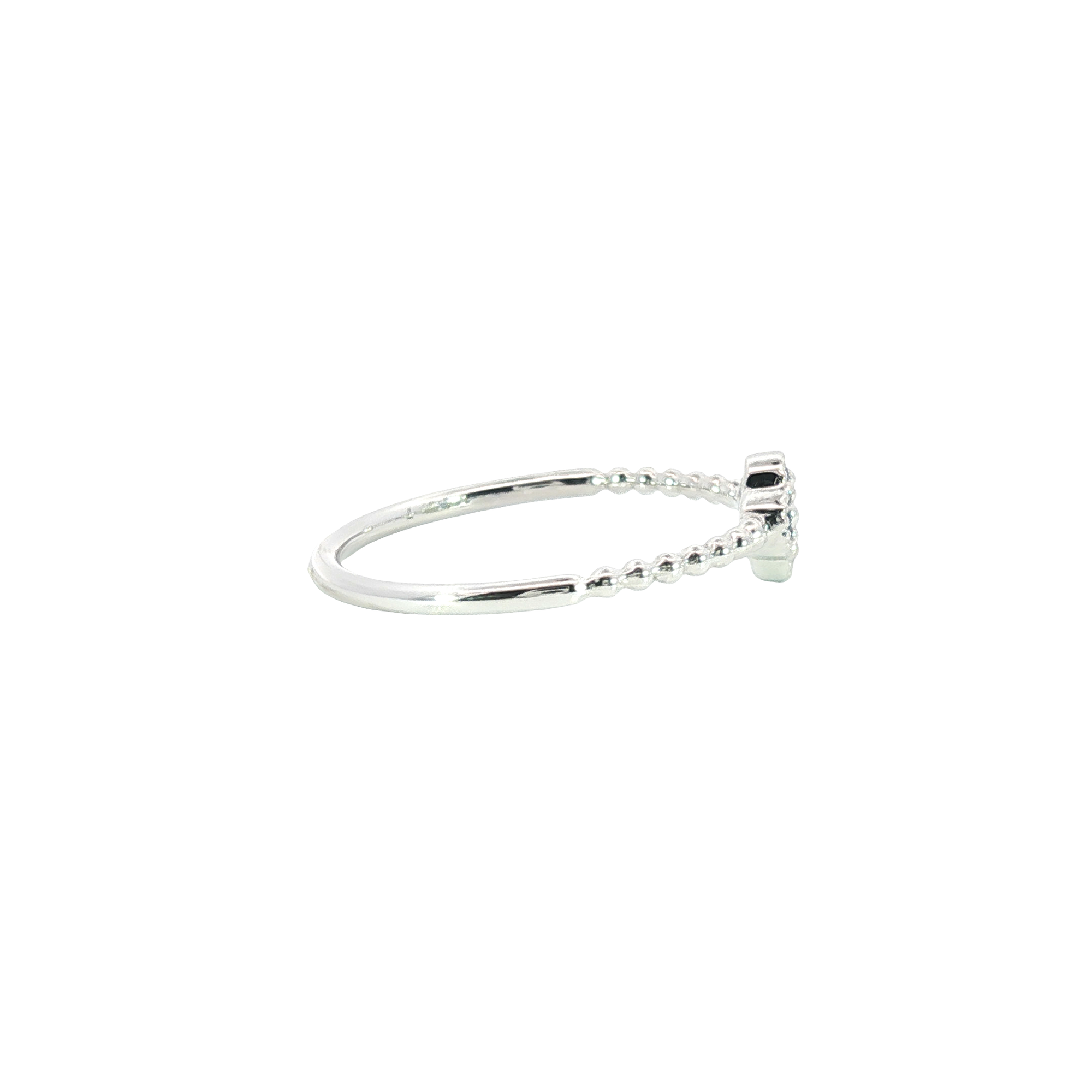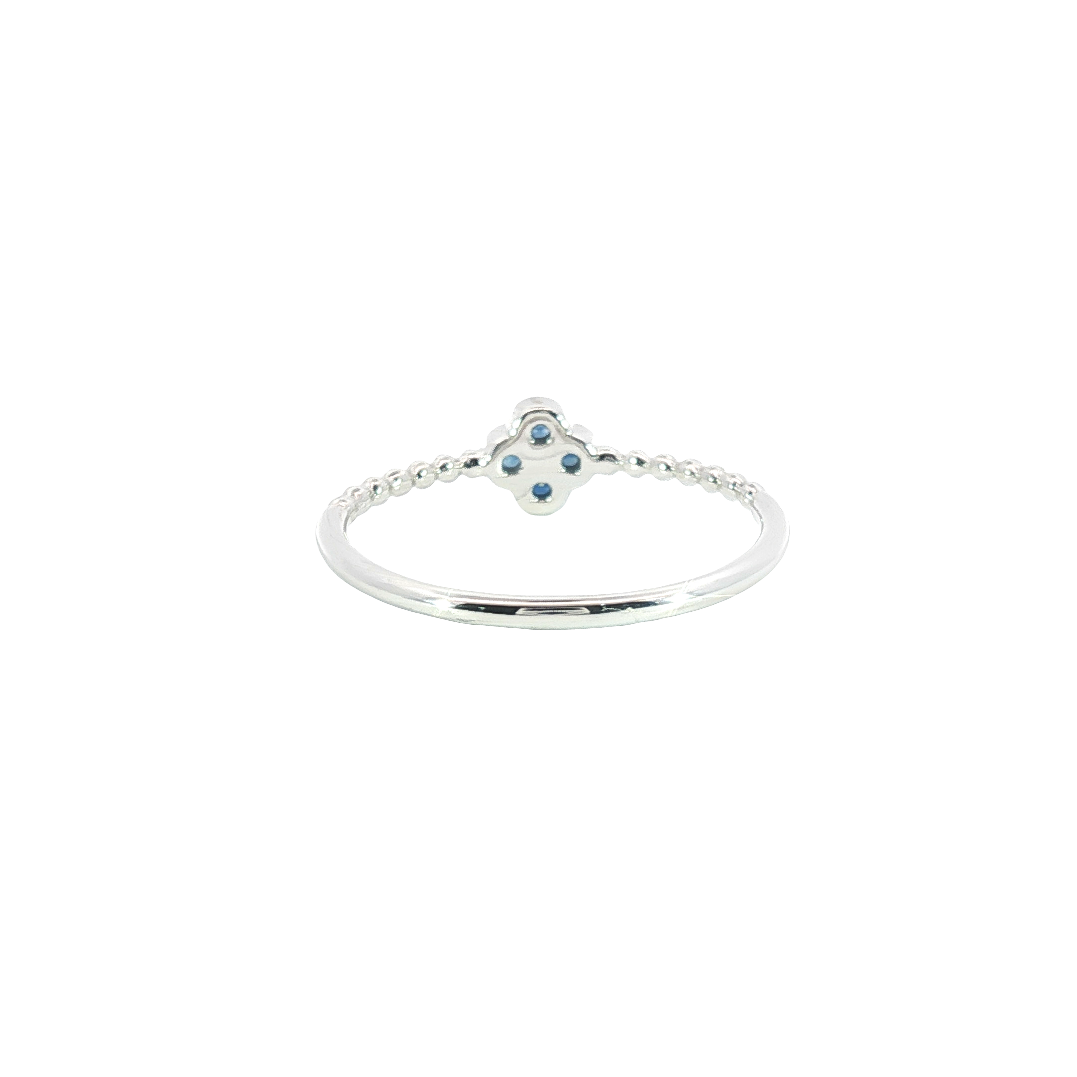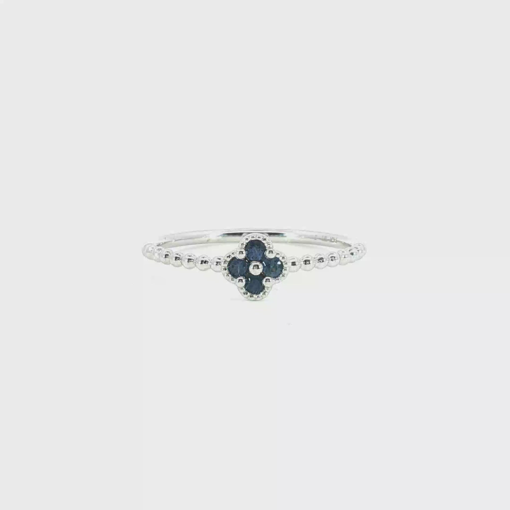 This elegant stackable ring features a polished 14K white gold band and a charming clover design crafted from four deep blue, round faceted sapphires. The rich blue stones stand out beautifully against the bright white gold, creating a soft yet eye-catching pop of color. Delicate and easy to wear, this ring adds a refined touch to any look and layers effortlessly with other pieces. The four sapphires together total 0.15 carats.