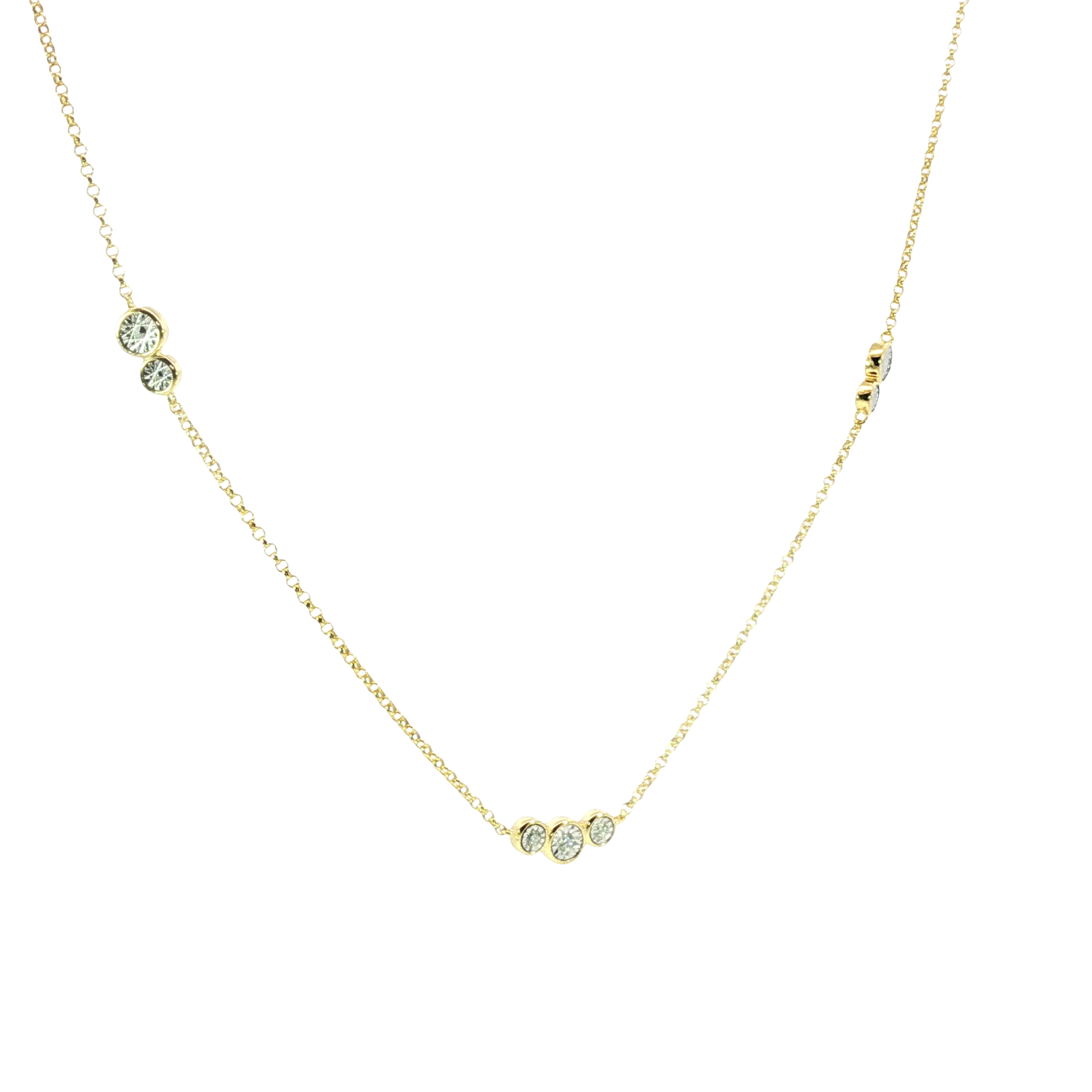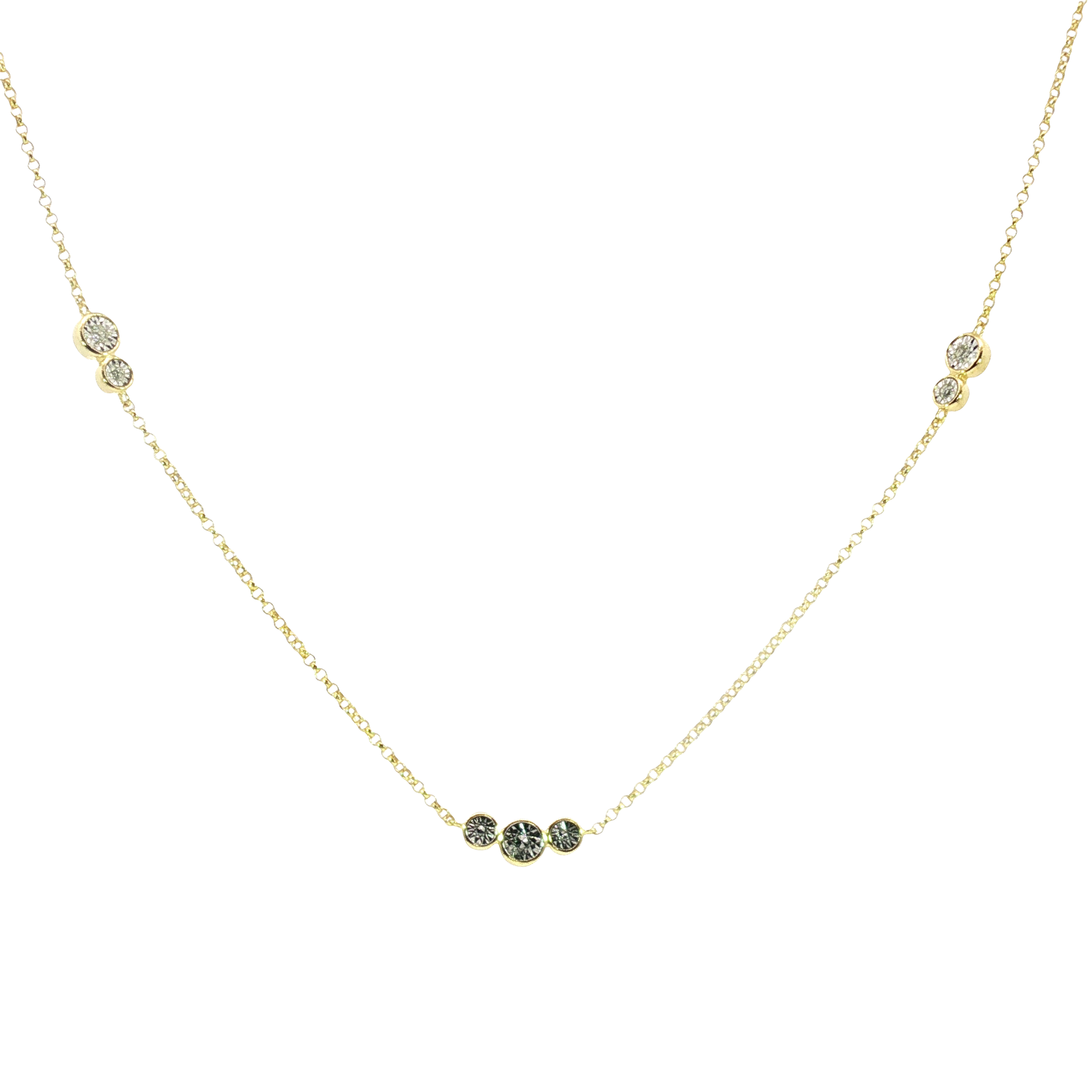 Elevate your style with this delicate sterling silver 14K yellow gold plated chain necklace. Featuring a series of brilliant round cut lab grown diamonds, this necklace exudes understated elegance. The transparent diamonds are meticulously set along the chain, creating a graceful and refined aesthetic. A perfect layering piece or a subtle statement on its own. 22 inch chain.