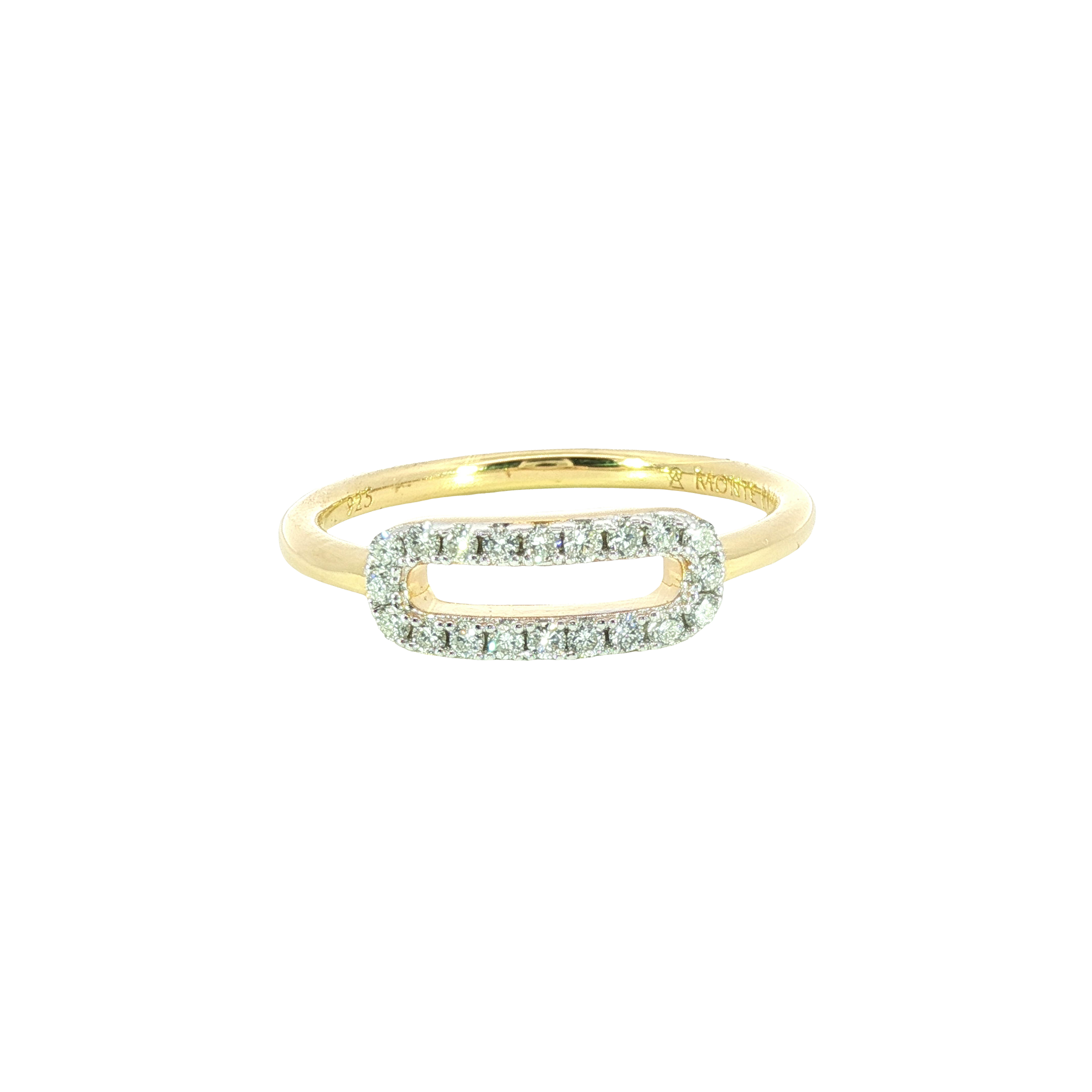 This exquisite multistone ring showcases a modern design, crafted from radiant sterling silver with 14K yellow gold plating. The horizontally placed ring features a series of brilliant round cut lab grown diamonds, adding a touch of sparkle. A testament to fine craftsmanship, this ring is perfect for adding a touch of luxury to any ensemble.