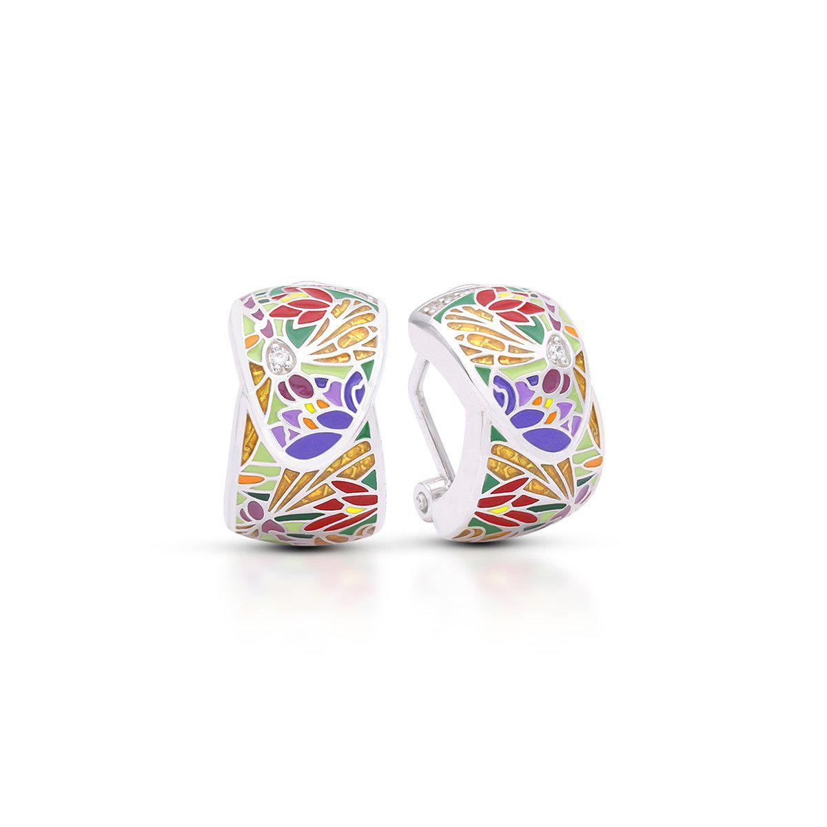 Description: Hand-painted Italian enamel with white stones set into rhodium-plated, nickel allergy-free, 925 sterling silver with translucent enamel wings