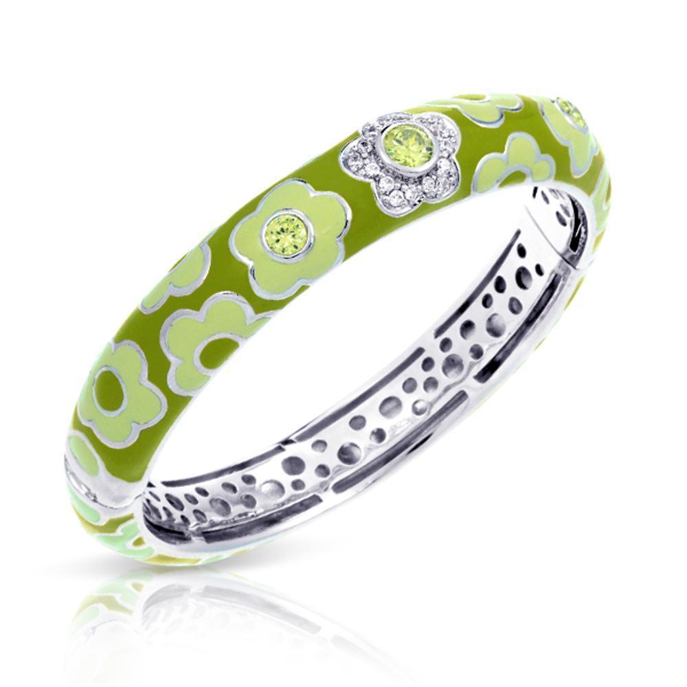 Green: Hand-painted green Italian enamels with white and peridot stones set into rhodium-plated, nickel allergy-free, 925 sterling silver