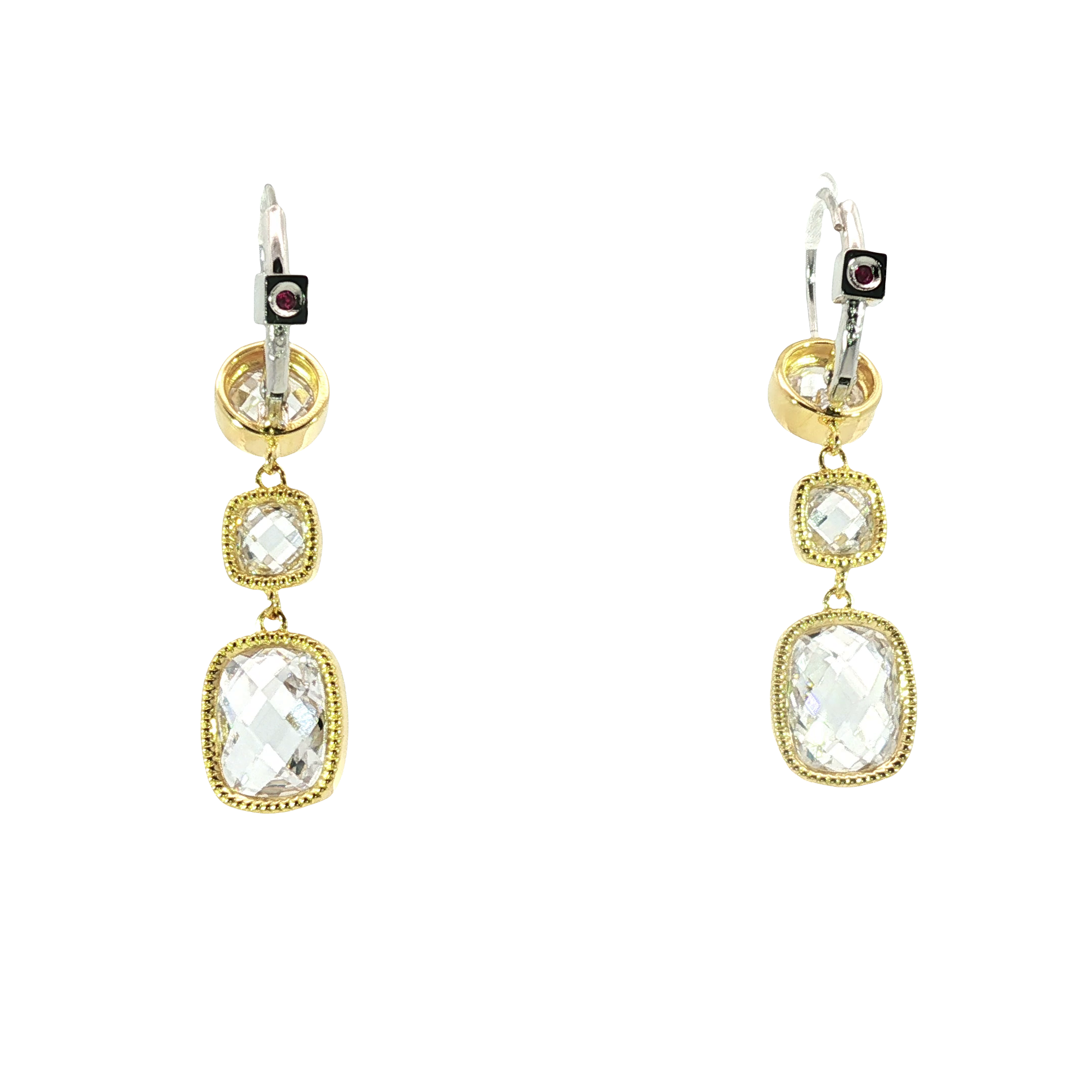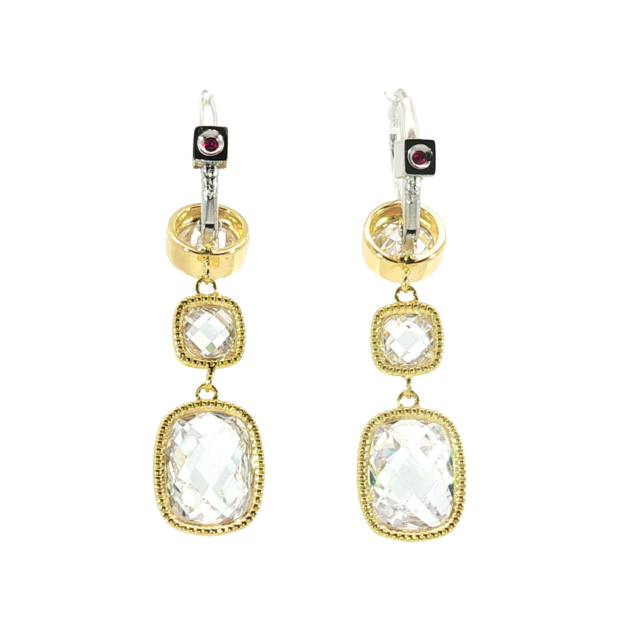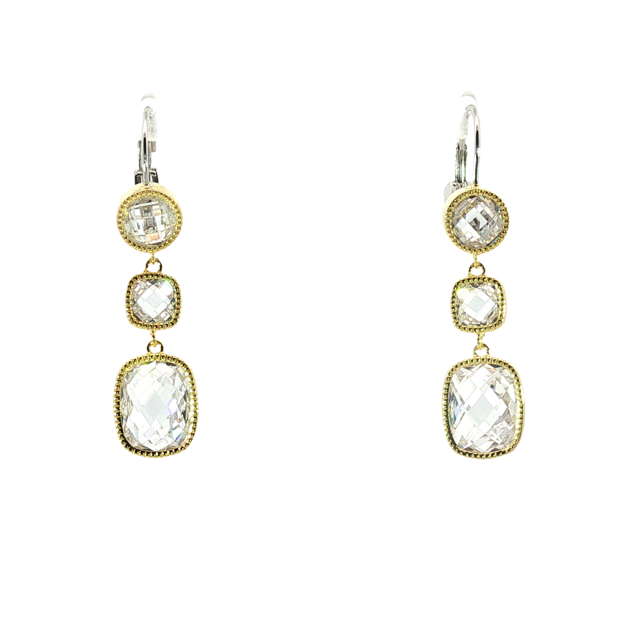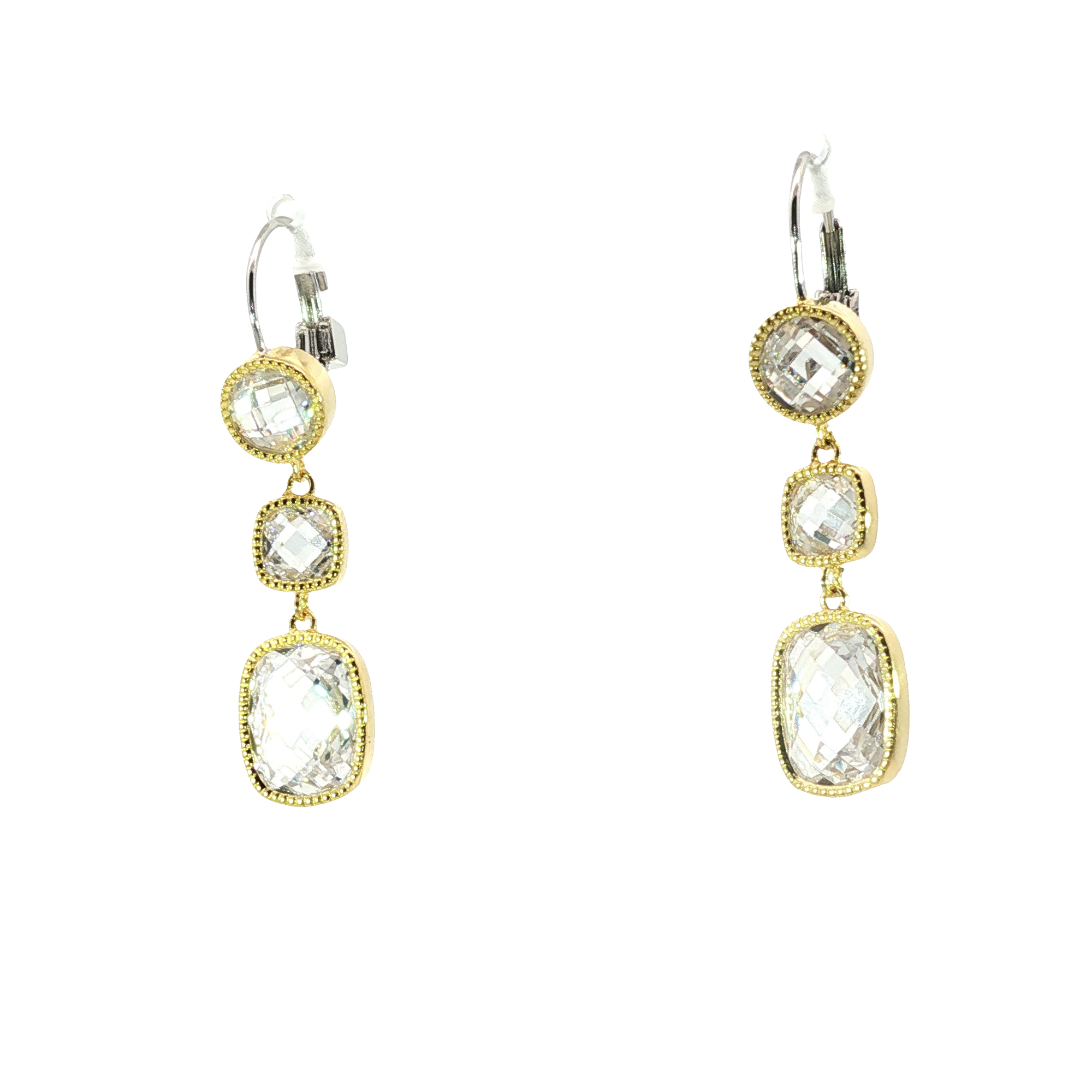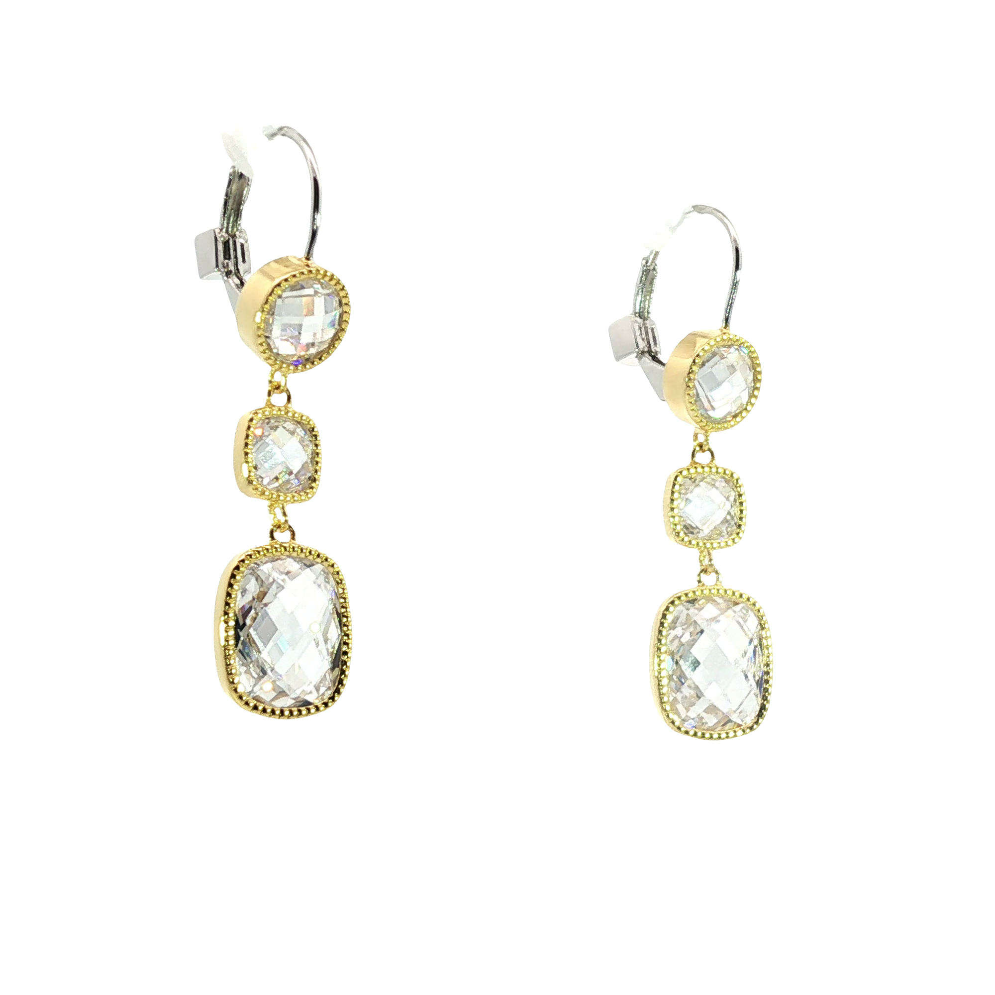 Exquisite dangle earrings crafted in radiant sterling silver yellow gold rhodium plating, each earring features a graduated arrangement of cushion cut cubic zirconias. The gems exhibit exceptional brilliance and transparency, resulting in a stunning cascade of light and shimmer. These elegant earrings are a timeless accessory, perfect for adding a touch of sophistication to any ensemble.