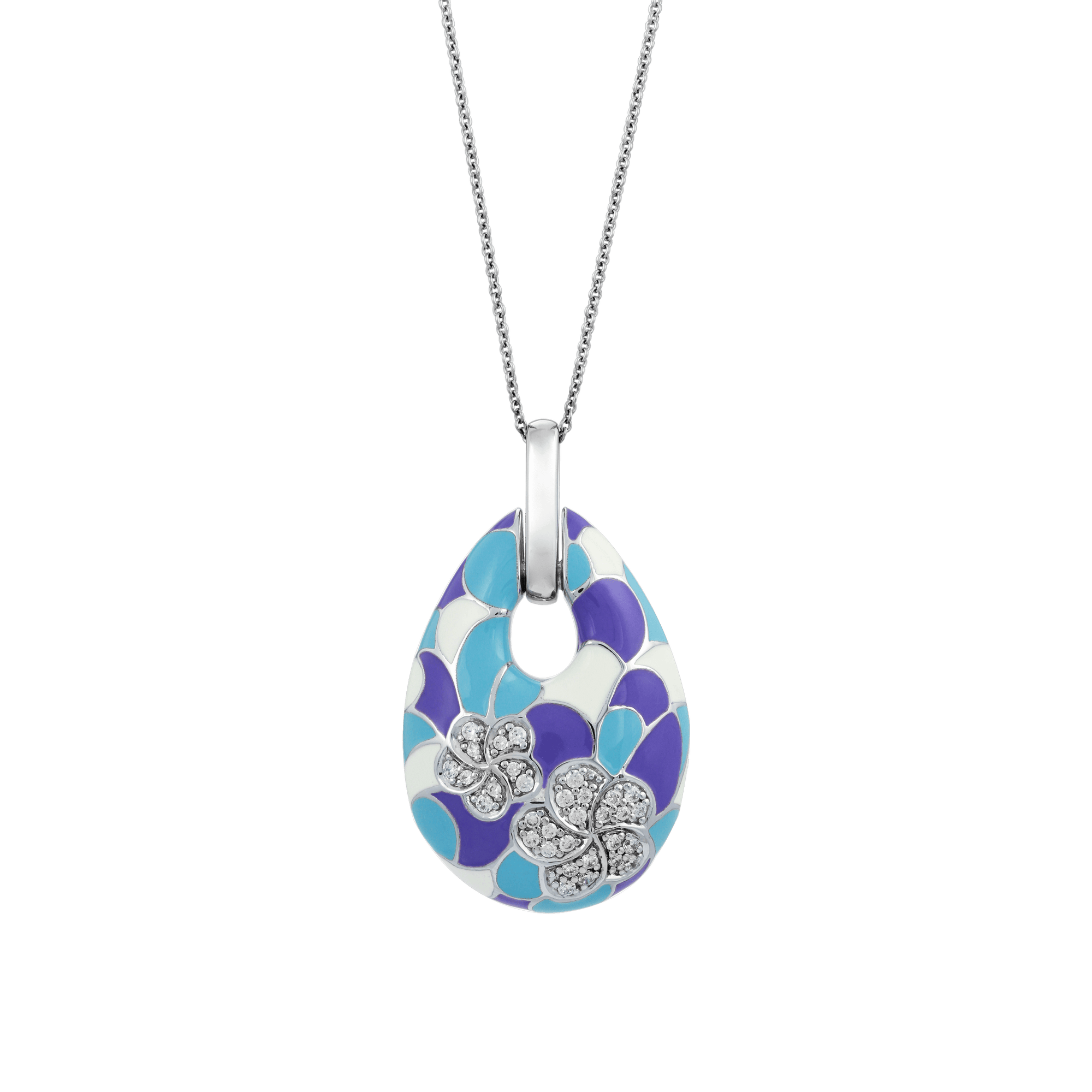 Hand-painted green and cream or blue and purple Italian enamels with white stones set into rhodium-plated, nickel allergy-free, 925 sterling silver Please note: This pendant is shown with the suggested chain but is not included in the price displayed.