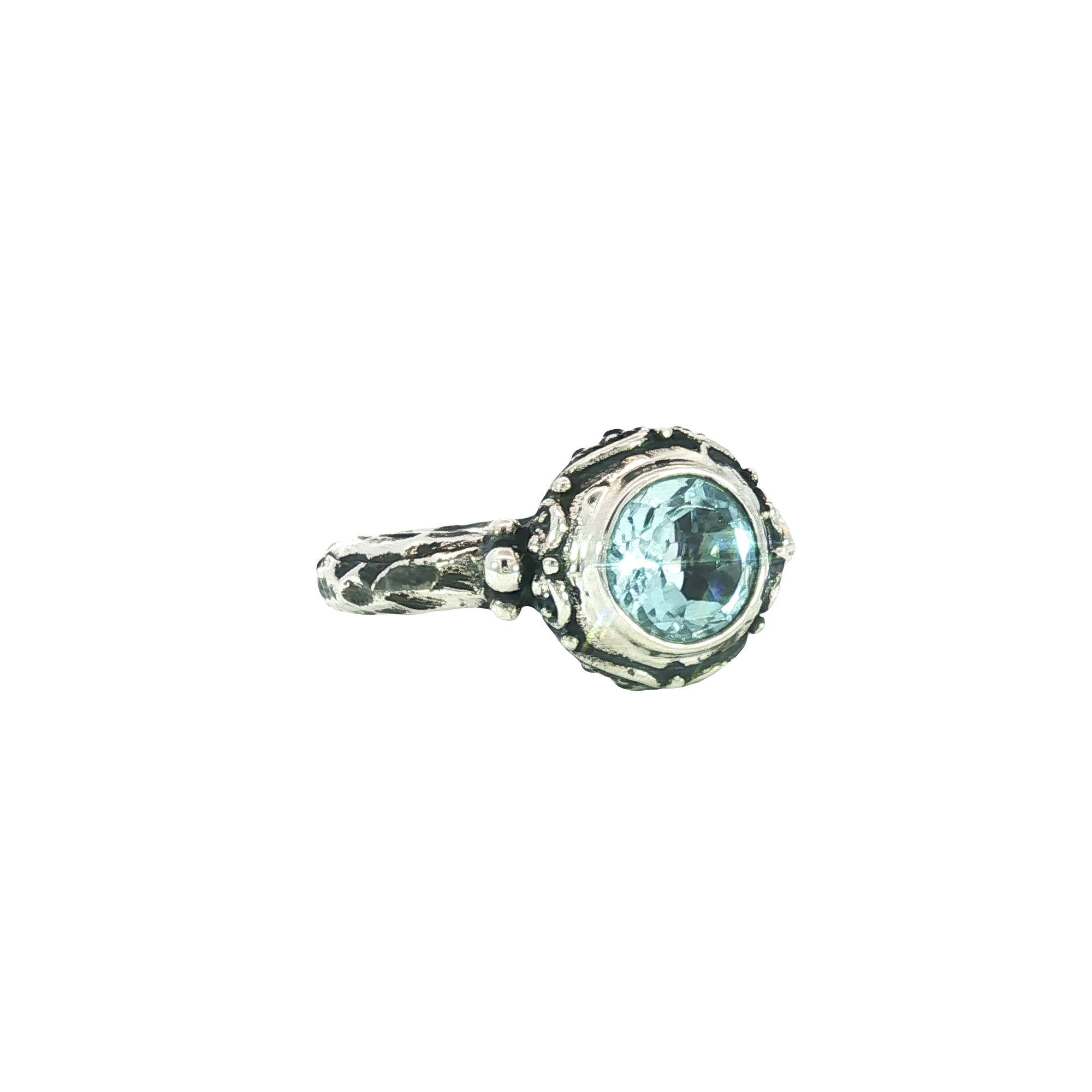 Embrace serene elegance with this sterling silver solitaire ring that is finished with a subtly hammered texture for an artisanal look. At its center sits an 8 mm round brilliant cut aquamarine, glowing with a cool, refreshing blue that evokes calm and clarity. The softly sculpted silver setting adds depth and a hint of antiquity, making this ring equally suited for stacking or wearing on its own as a quiet statement. A bold design with distinctive character and effortless charm.
