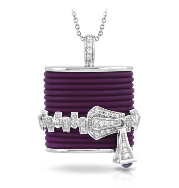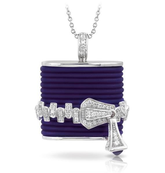 Black, Green, Blue, or Purple Italian rubber with pave-set stones set into rhodium-plated, nickel allergy-free, 925 sterling silver Please note: This pendant is shown with the suggested chain but is not included in the price displayed.