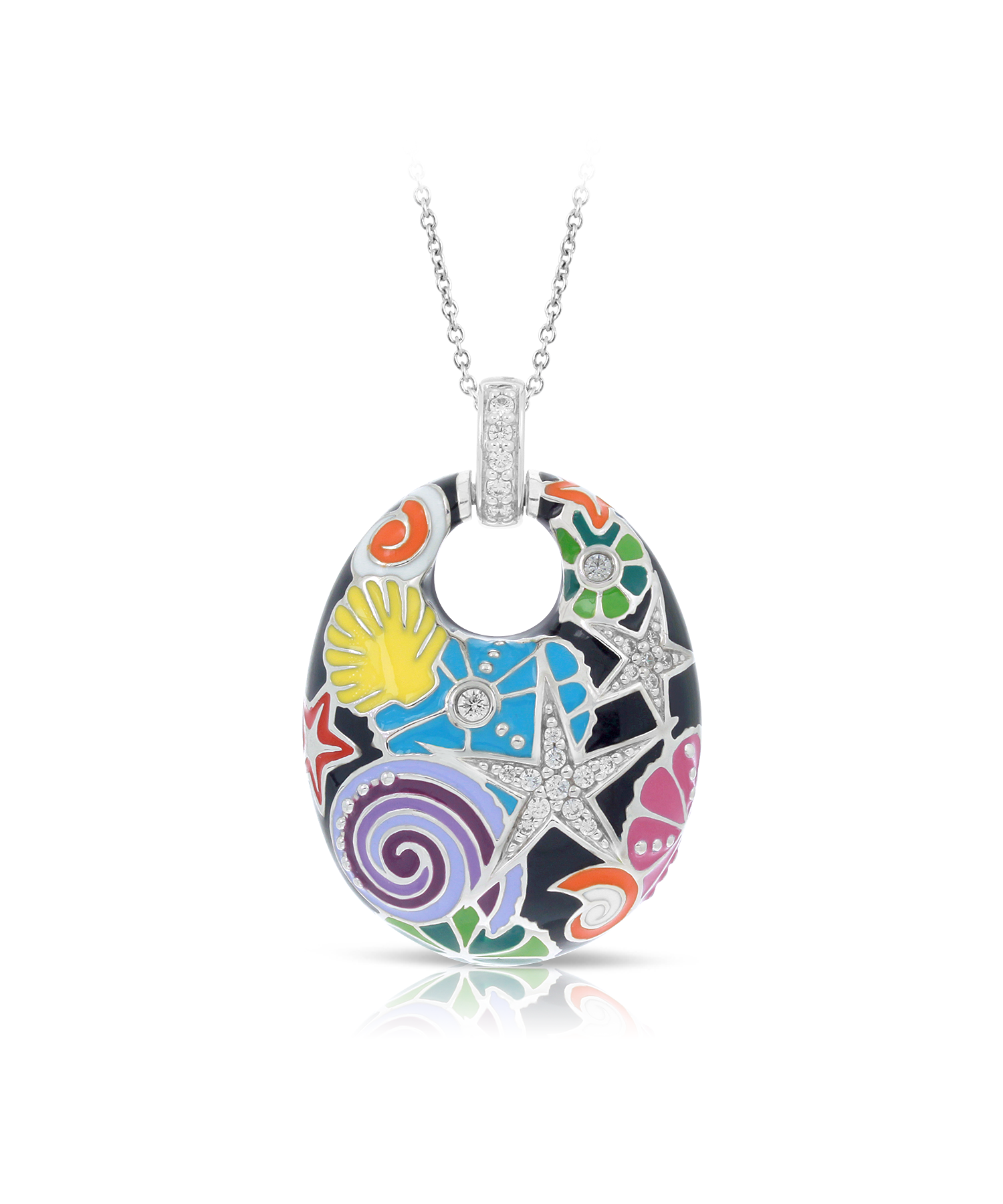Black: Hand-painted black and multicolored Italian enamel with pave-set stones set into rhodium-plated, nickel allergy-free, 925 sterling silver