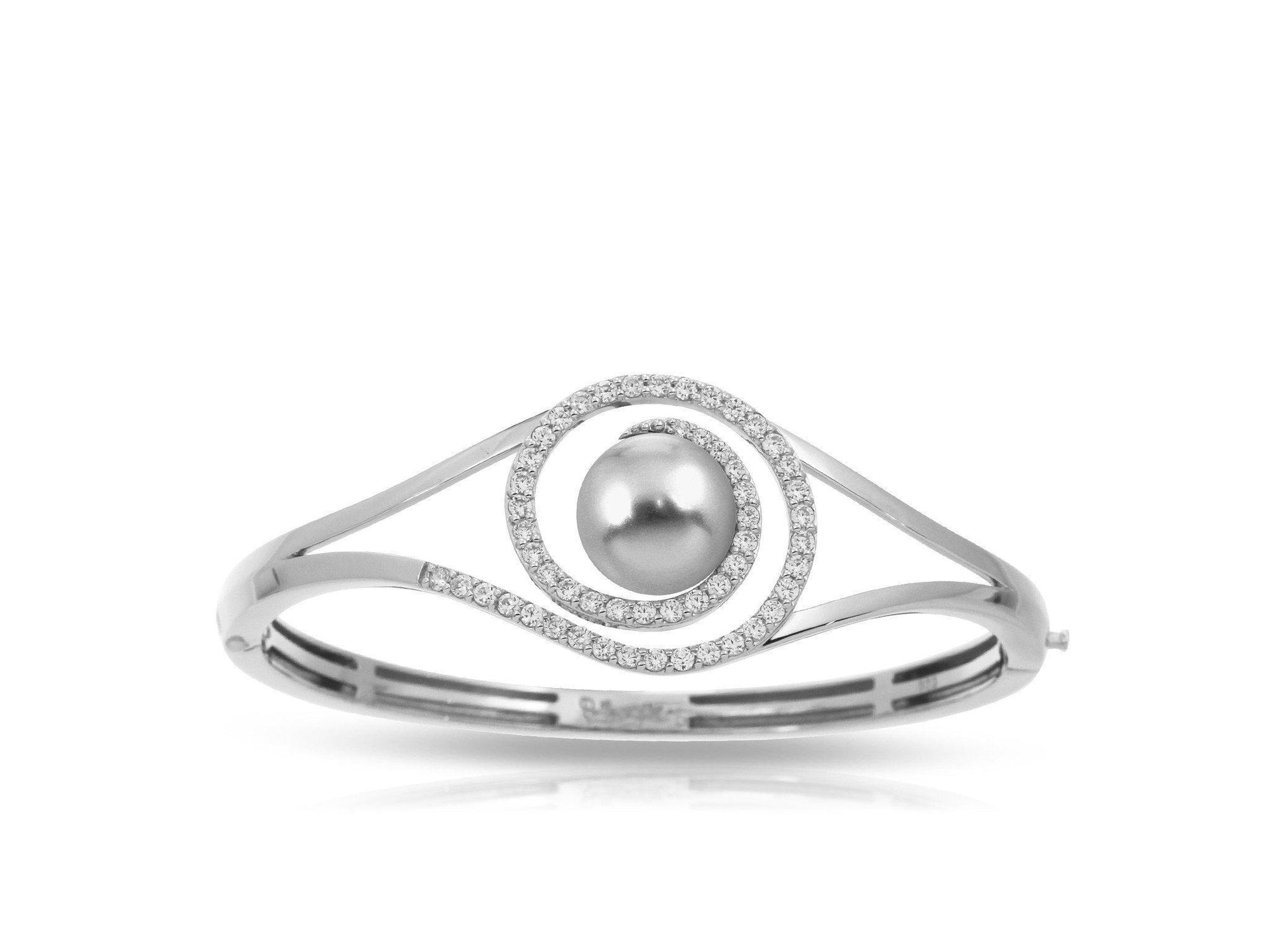 Grey: Grey Seashell Pearl with white stones set into rhodium-plated, nickel allergy-free, 925 sterling silver