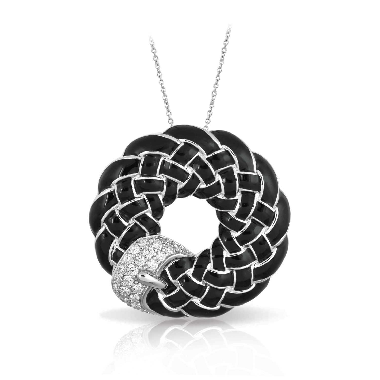Treccia Bangle by Belle Etoile. Hand-painted Italian enamel with white stones set into rhodium-plated, nickel allergy-free, 925 sterling silver Please note: This pendant is shown with the suggested chain but is not included in the price displayed.