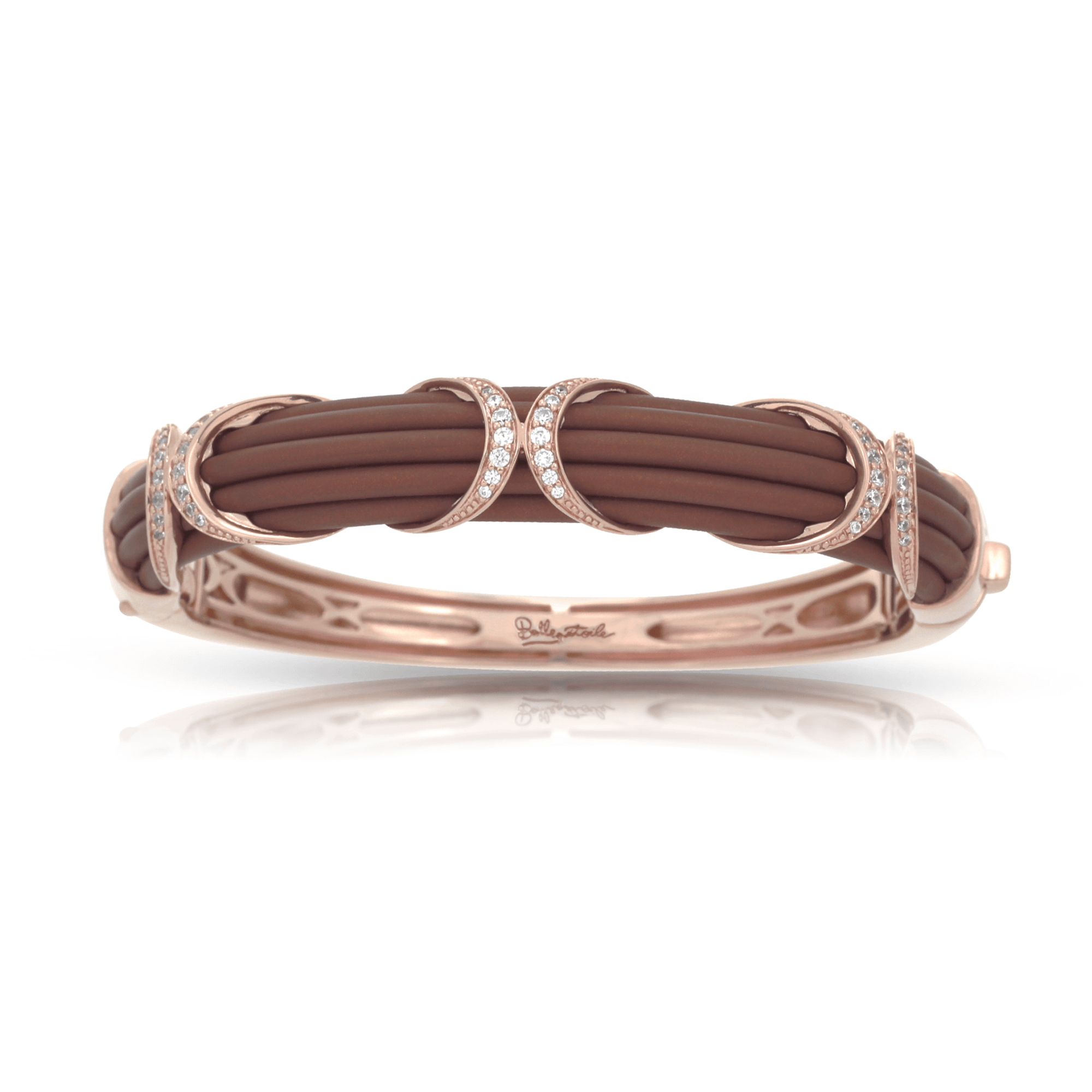 Brown and Rose Gold: Hand-strung brown Italian rubber with white stones set into 18K rose gold-plated, nickel allergy-free, 925 sterling silver