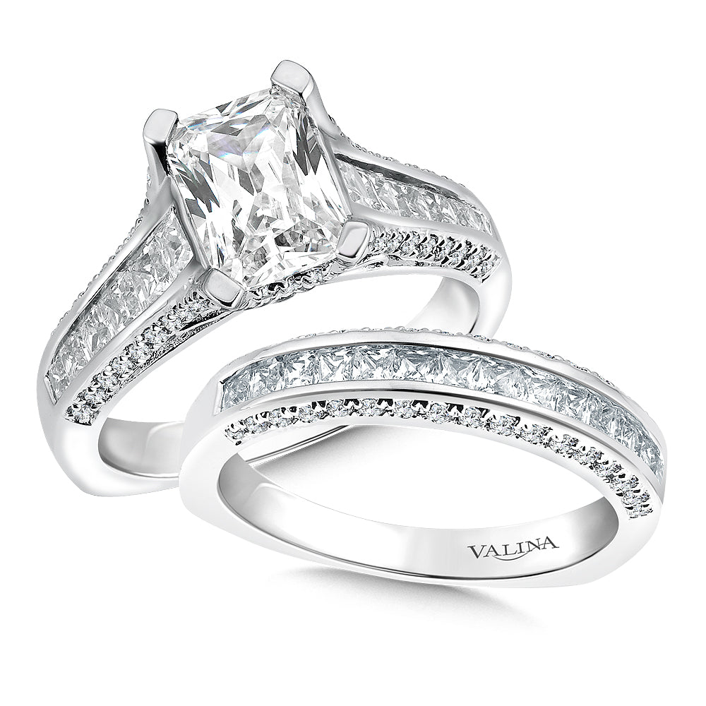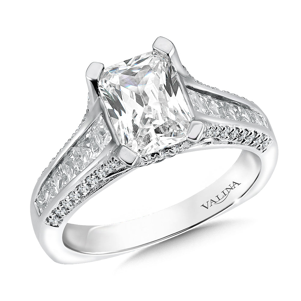 Introducing the Three Row 14K White Gold Cathedral Emerald Cut Engagement Ring, designed to make a statement and last a lifetime. This exquisite ring is crafted with 14K white gold and features cathedral shoulders with a center row of channel-set tapered princess cut stones trimmed with pave-set diamonds that rise up creating the prongs that securely set the emerald cut center stone. The diamonds and filigree in the gallery add a dramatic effe carat to this stunning piece of jewelry. This ring is perfe carat for those who want to make a bold statement with their engagement ring. The three rows of accent stones add depth and dimension to this already impressive design, and the emerald-cut center stone is the perfe carat finishing touch. The ring is expertly crafted to ensure it lasts a lifetime and can be passed down from generation to generation. If you're looking for an engagement ring that will take your breath away, the Three Row 14K White Gold Cathedral Emerald Cut Engagement Ring is the perfe carat choice. It's a timeless piece of jewelry that will make you feel special every time you wear it.