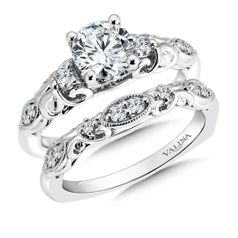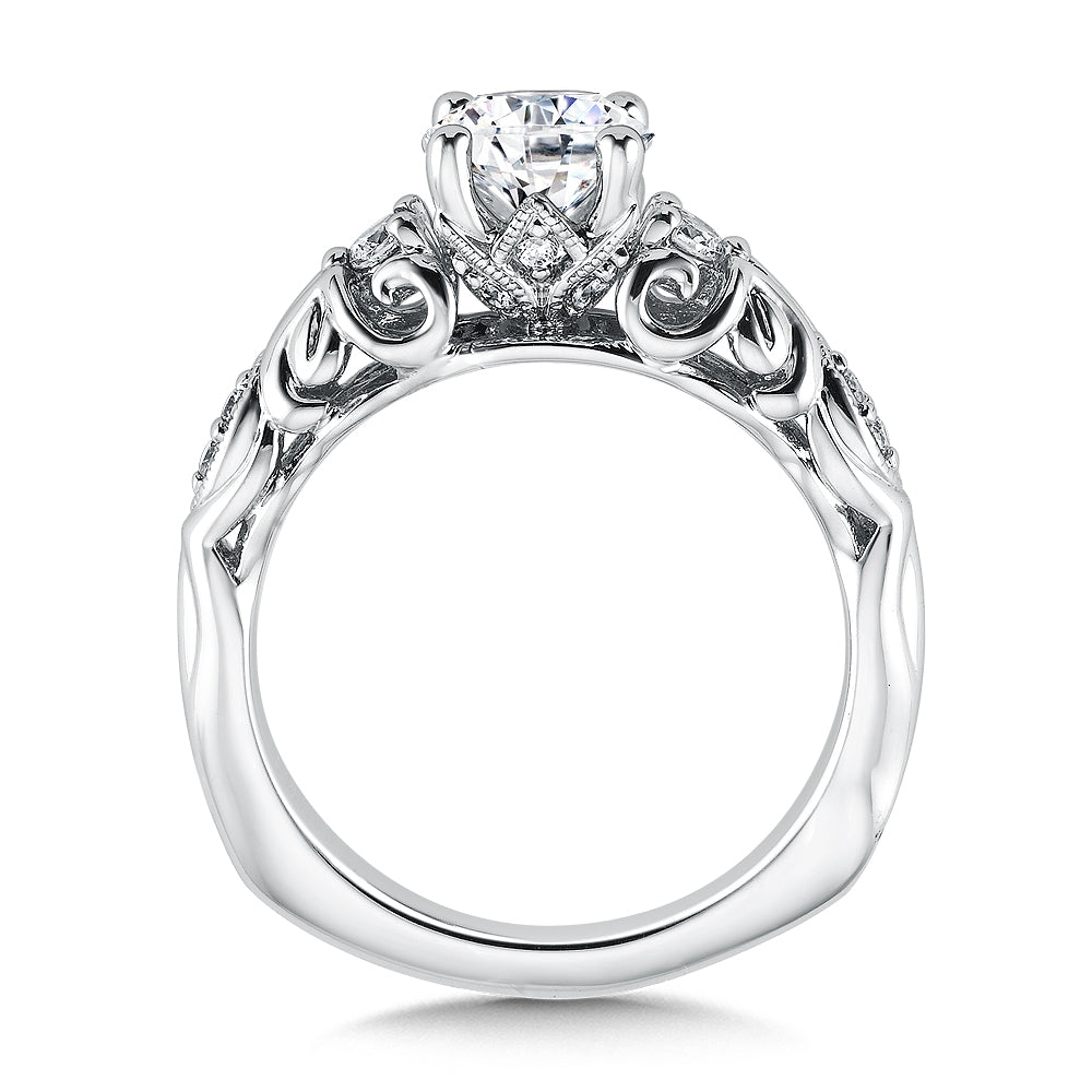 A center stone is flanked by side diamonds representing your past, present, and future. Diamonds and a carved motif decorate the shoulders creating delicate openwork in the ring's profile.