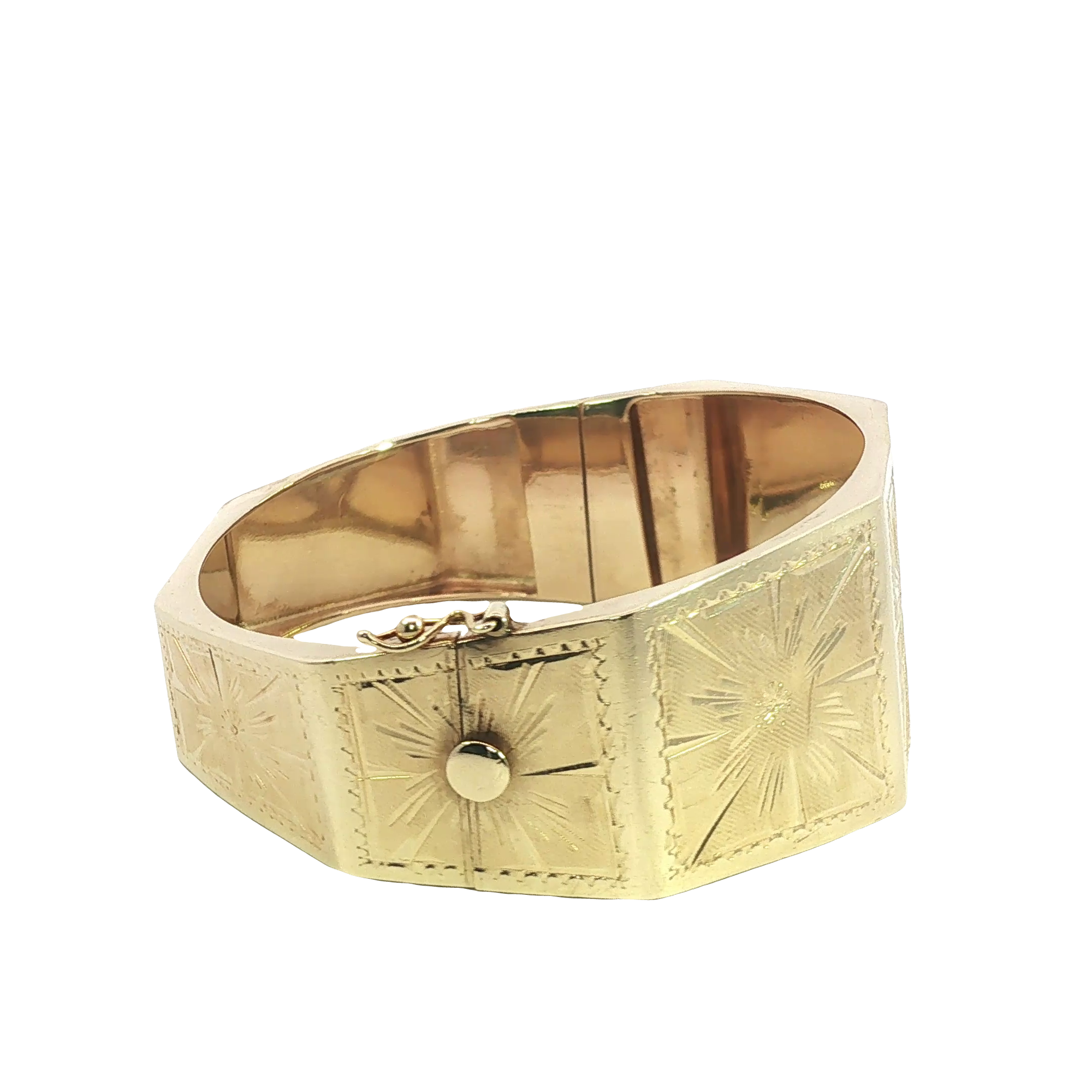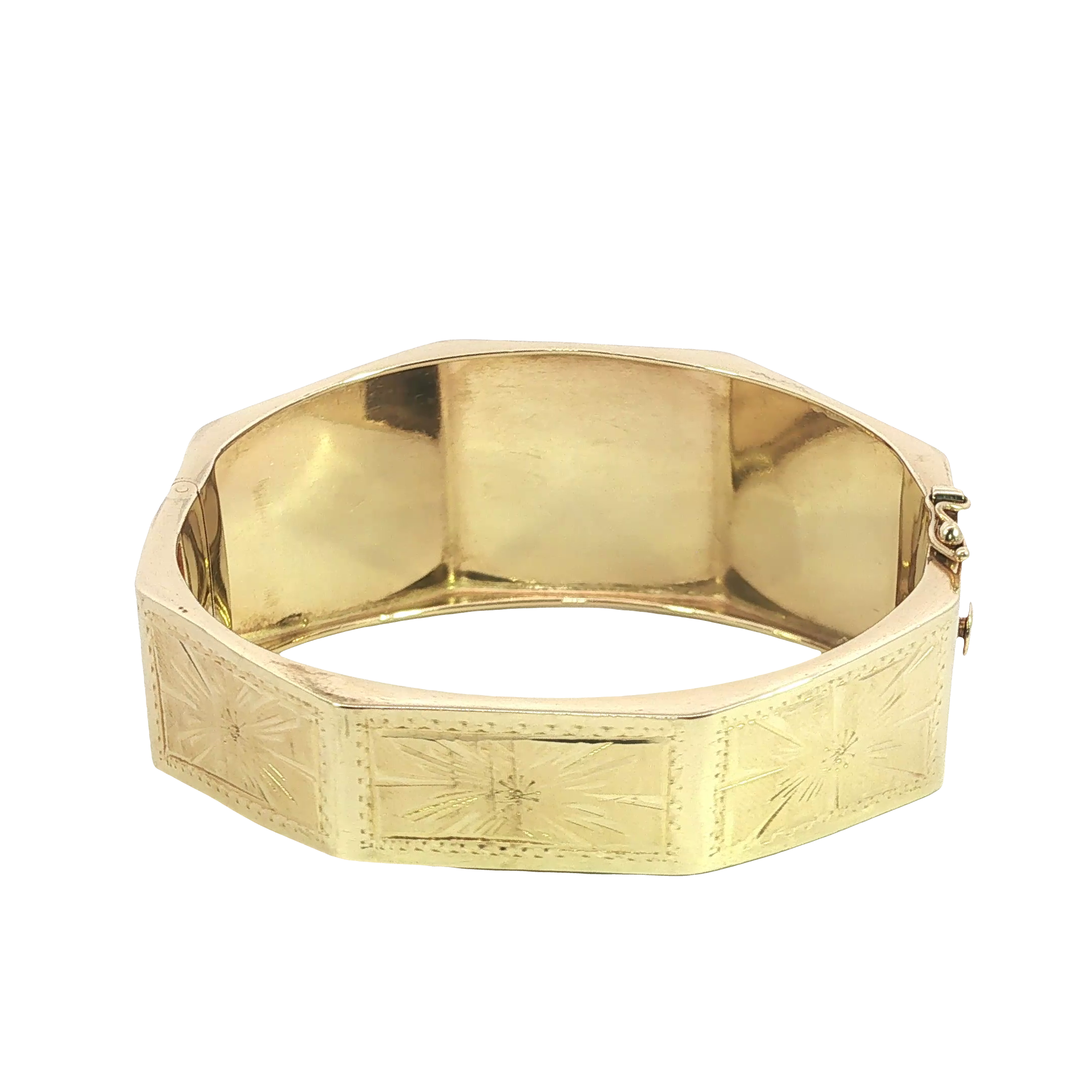 A wide, vintage-inspired 14K yellow gold bangle featuring an angular, multi-panel design. Each octagonal section displays a masterfully hand-engraved sunburst motif with rayed textures and decorative mil-grain bordering. This bold, architectural piece is finished with a polished high-shine interior and a secure side box clasp.