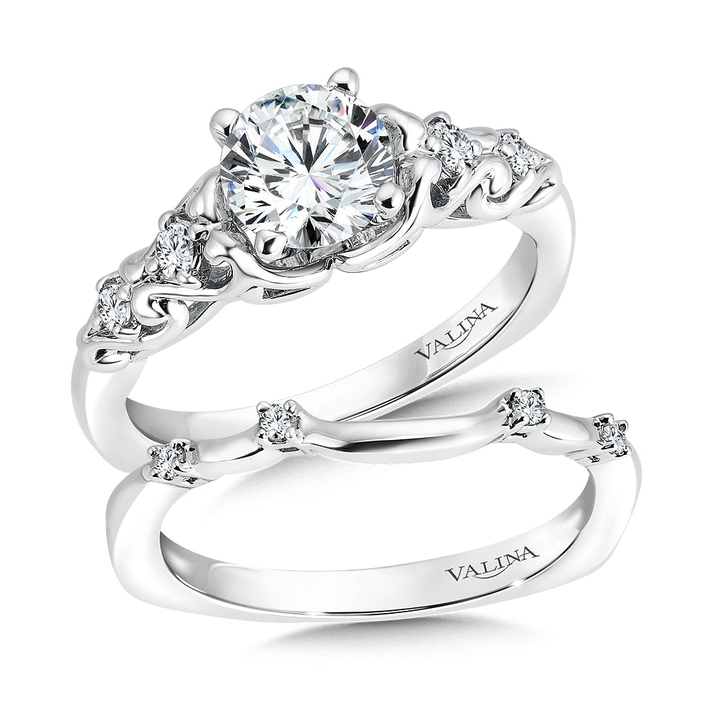An open polished scalloped design with floating diamonds decorates the shoulders of this vintage-inspired ring. In the cathedral profile, open scrolls create a unique look.