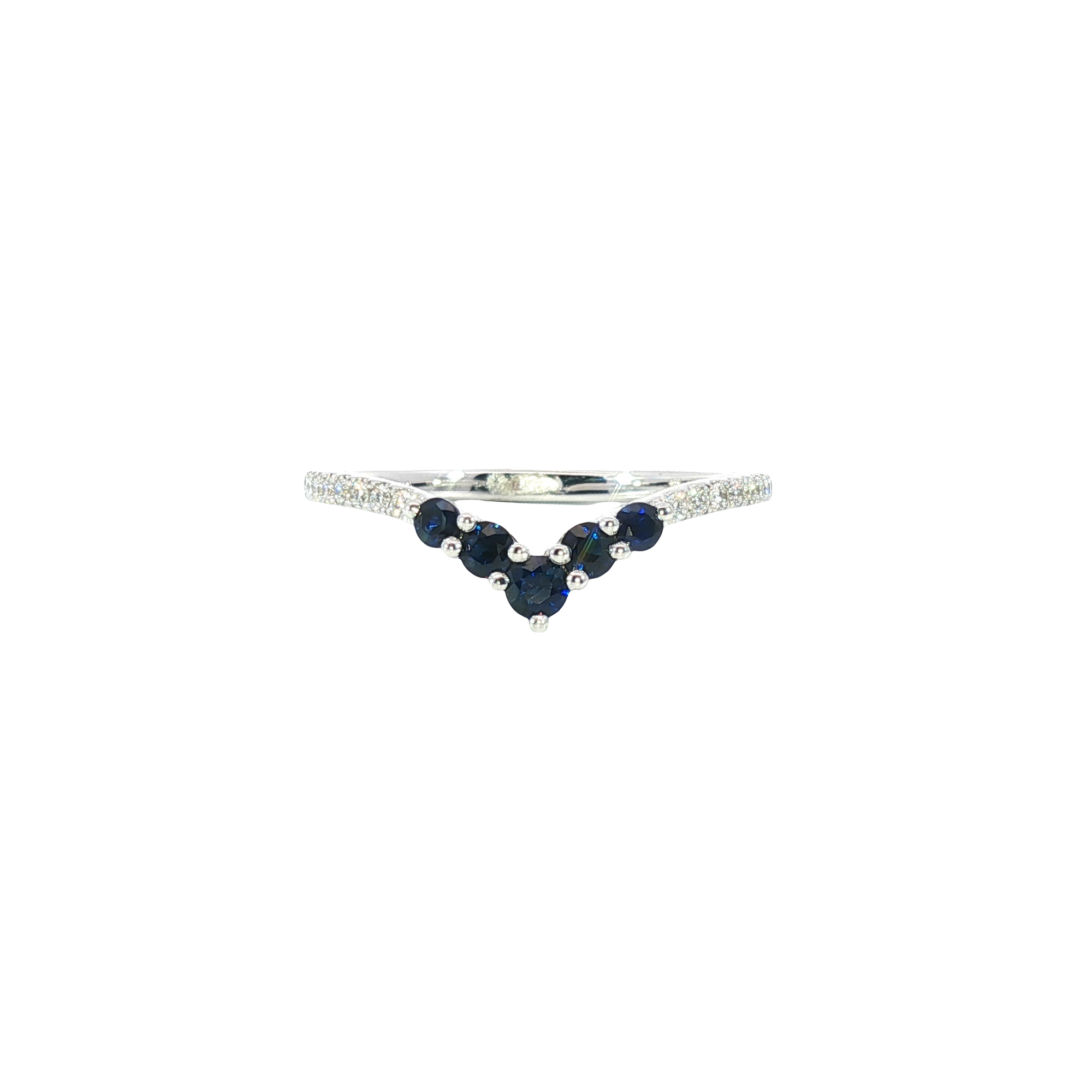 Enhance your jewelry collection with this exquisite stackable ring. Crafted in lustrous 14K white gold, the ring features a row of round cabochon-cut sapphires with a deep blue hue. The gemstones are carefully selected for their VS clarity and set with good polish and symmetry, creating a stunning and elegant piece.