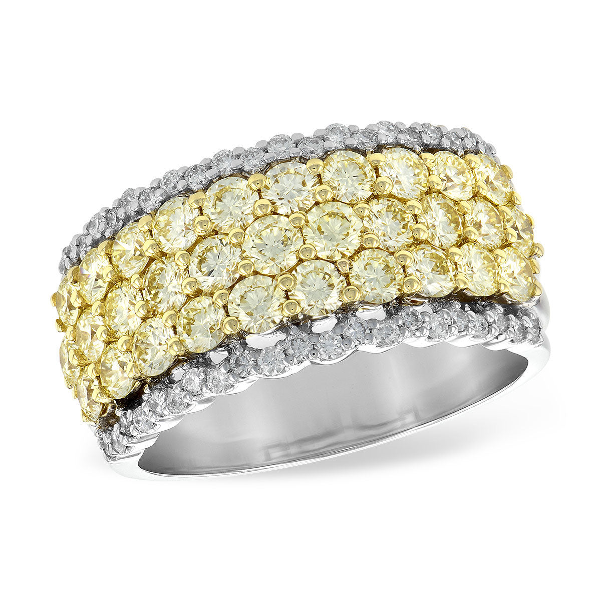 Celebrate your love and commitment with this stunning wide 14K two-tone gold five row yellow & white diamond anniversary band. Crafted with precision and elegance, this ring features 5 rows of sparkling diamonds set in 14K two-tone gold. The center 3 rows are stacked with vibrant canary yellow diamonds, adding a pop of color to this breathtaking piece of jewelry. The yellow diamonds are framed by shimmering white accent diamonds, creating a beautiful contrast and completing the five rows. This ring is the epitome of class and sophistication, perfect for any special occasion. Let this exquisite diamond band be a symbol of your love and devotion.
