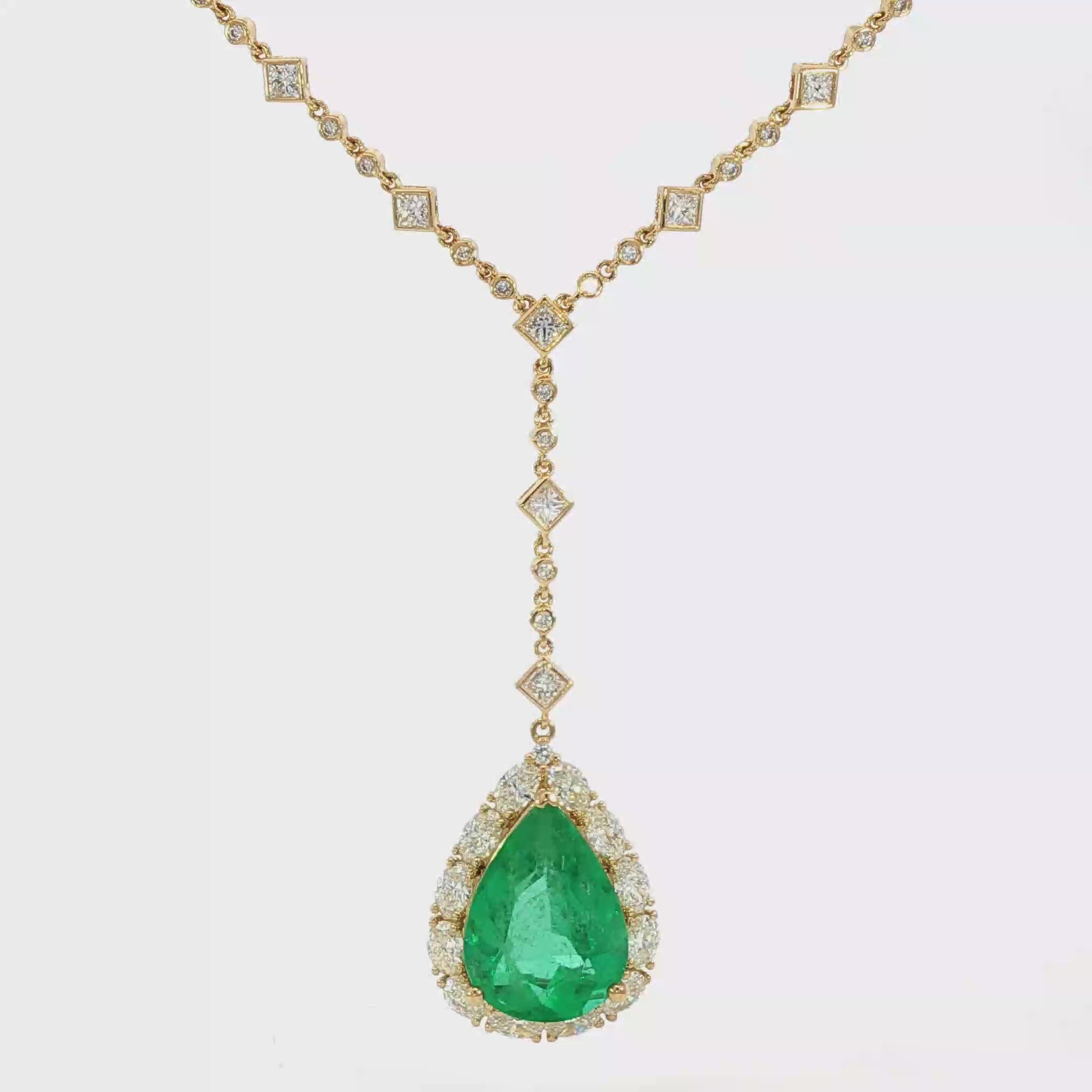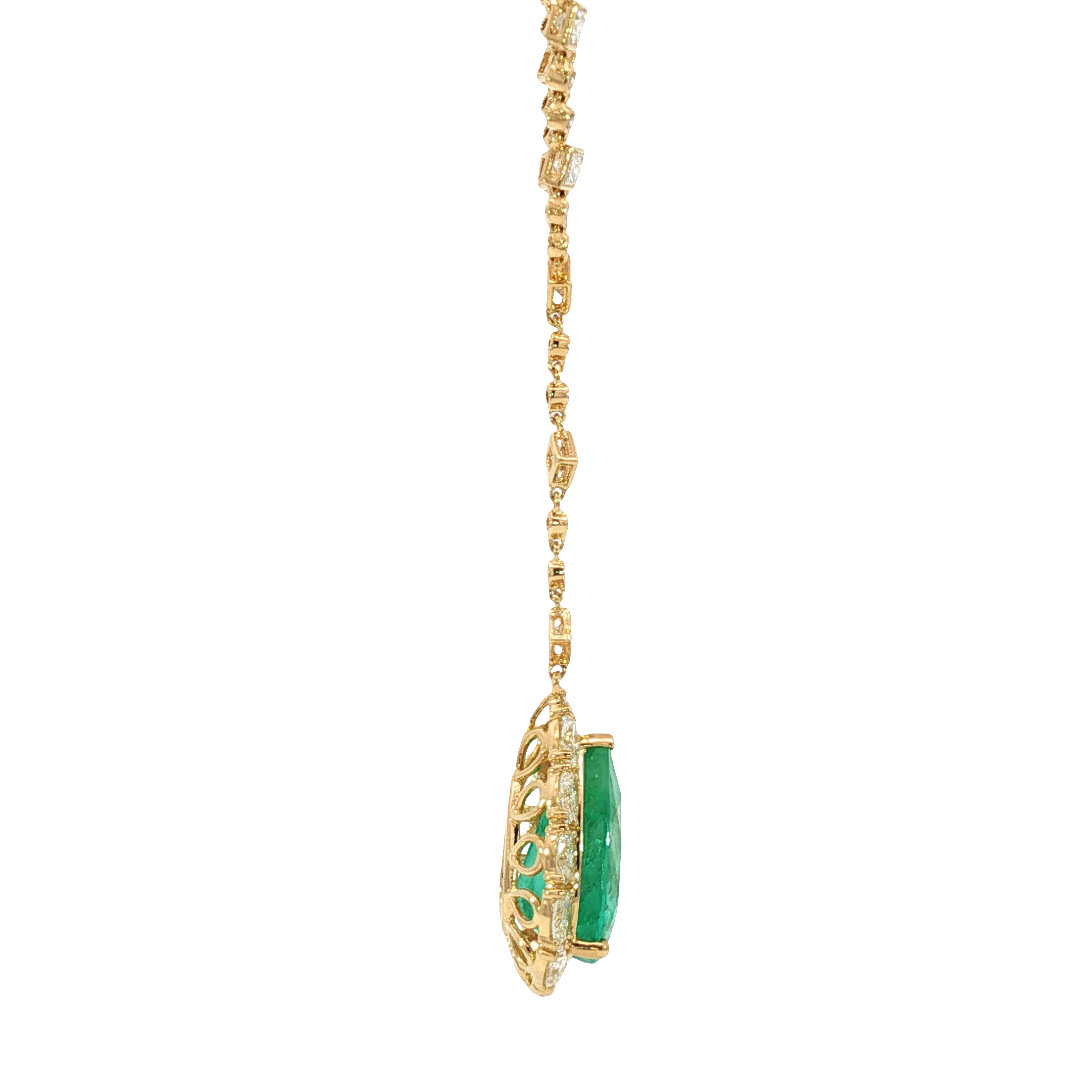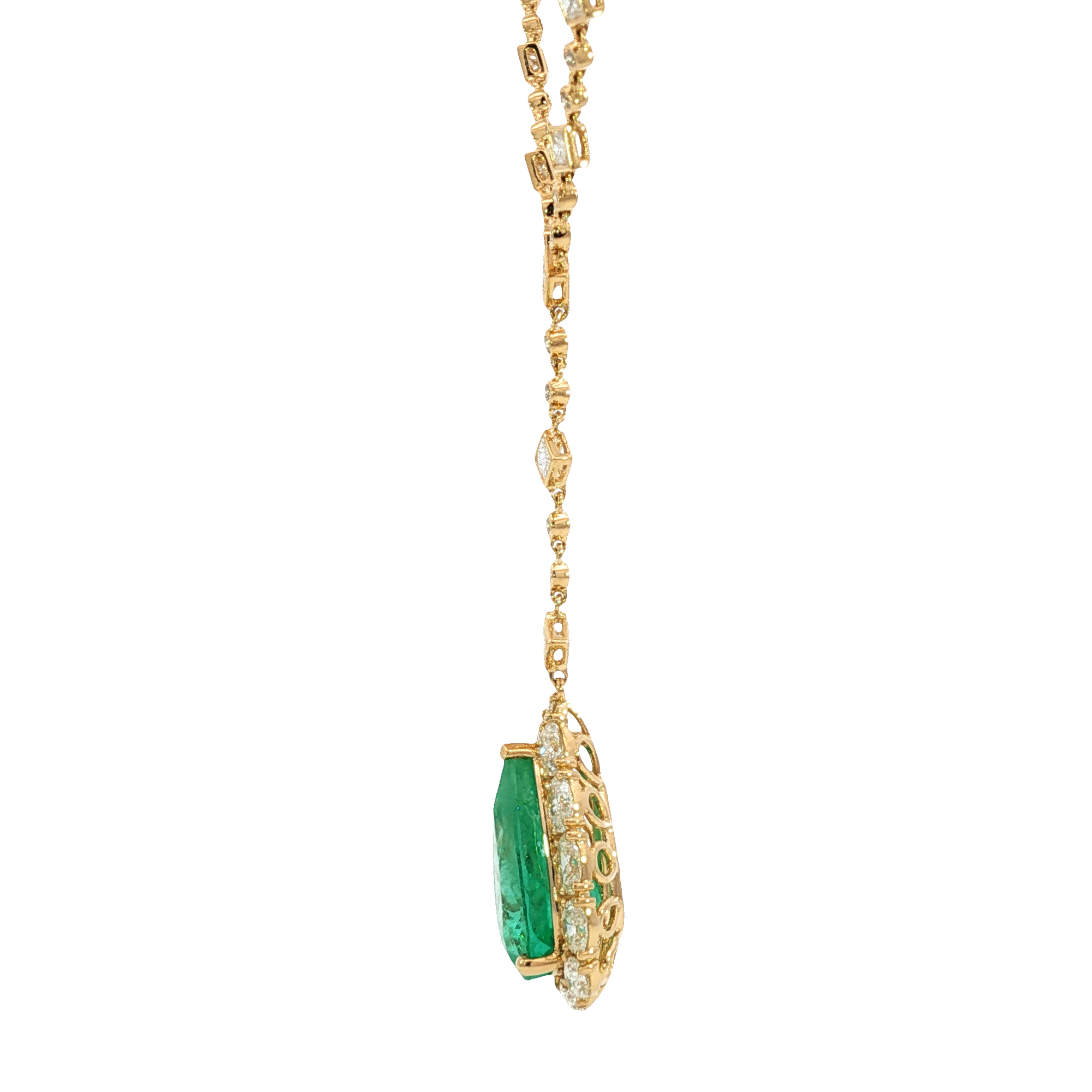 Indulge in the timeless elegance of this yellow gold charm necklace featuring a mesmerizing pear-shaped emerald. The pear shape cut emerald radiates with a captivating green hue, making this necklace a refined statement piece. The necklace's design showcases an exceptional harmony between classic and contemporary aesthetics. This piece epitomizes understated luxury, perfect for adding a touch of sophistication to any ensemble.