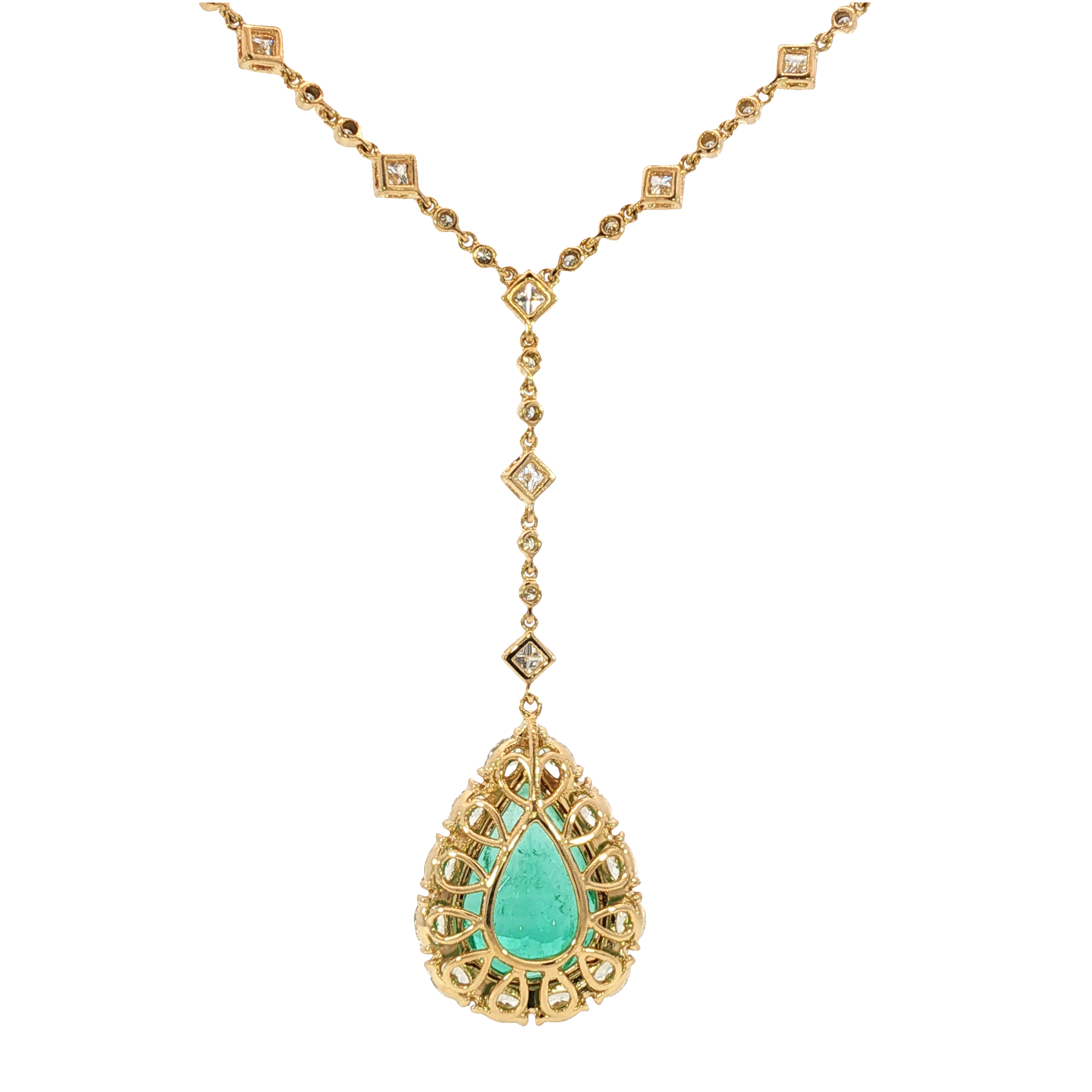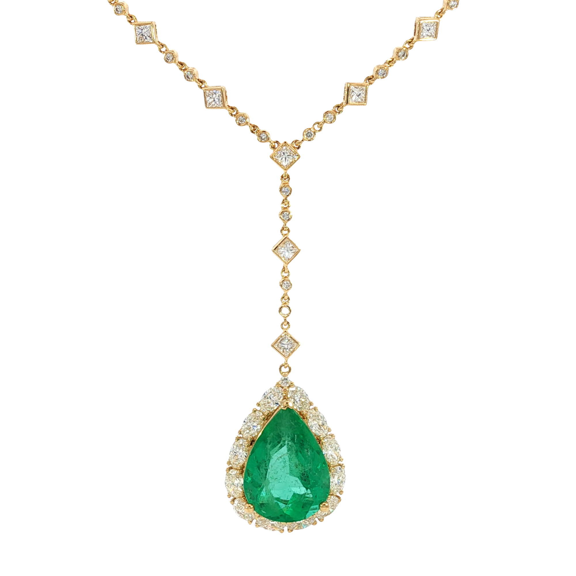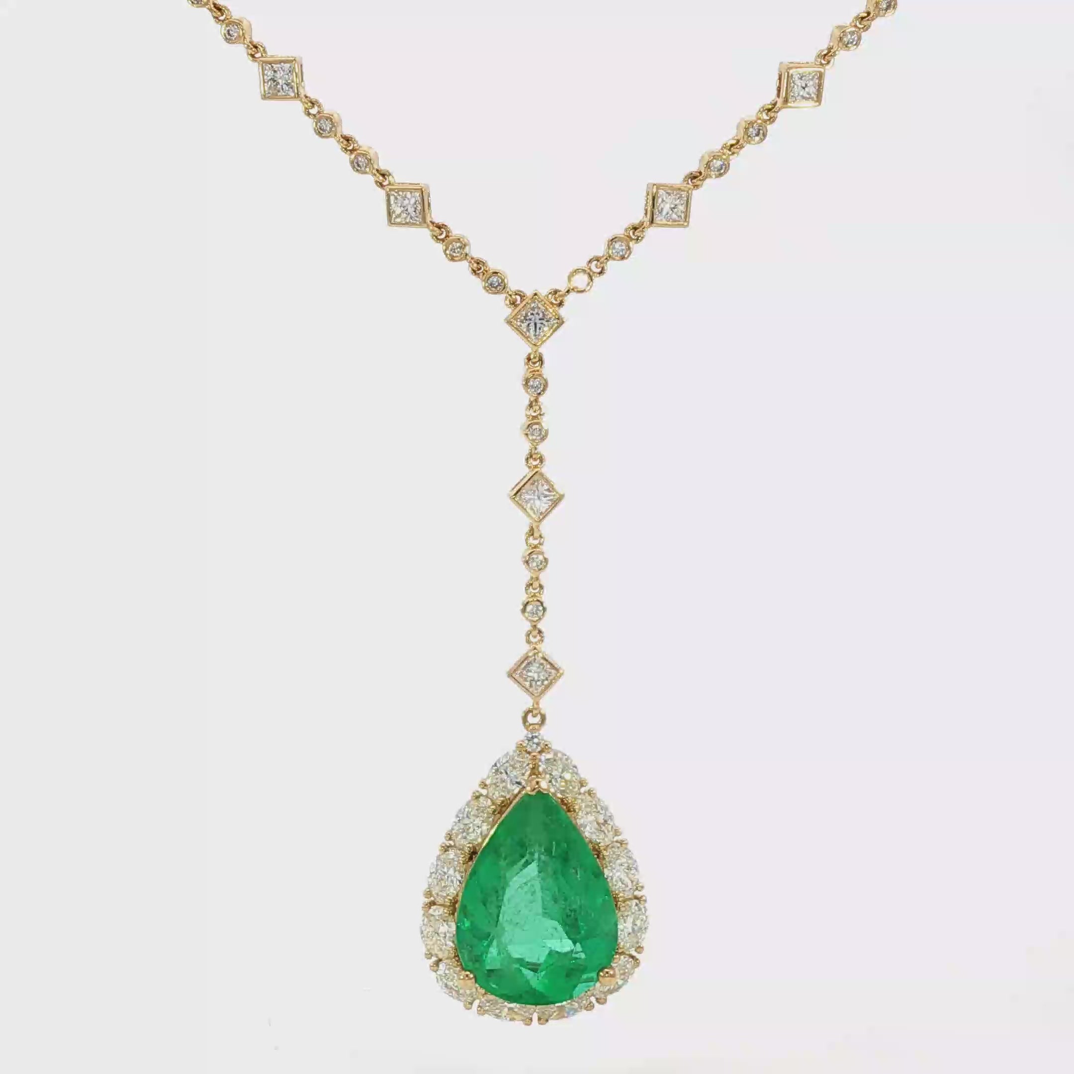 Indulge in the timeless elegance of this yellow gold charm necklace featuring a mesmerizing pear-shaped emerald. The pear shape cut emerald radiates with a captivating green hue, making this necklace a refined statement piece. The necklace's design showcases an exceptional harmony between classic and contemporary aesthetics. This piece epitomizes understated luxury, perfect for adding a touch of sophistication to any ensemble.