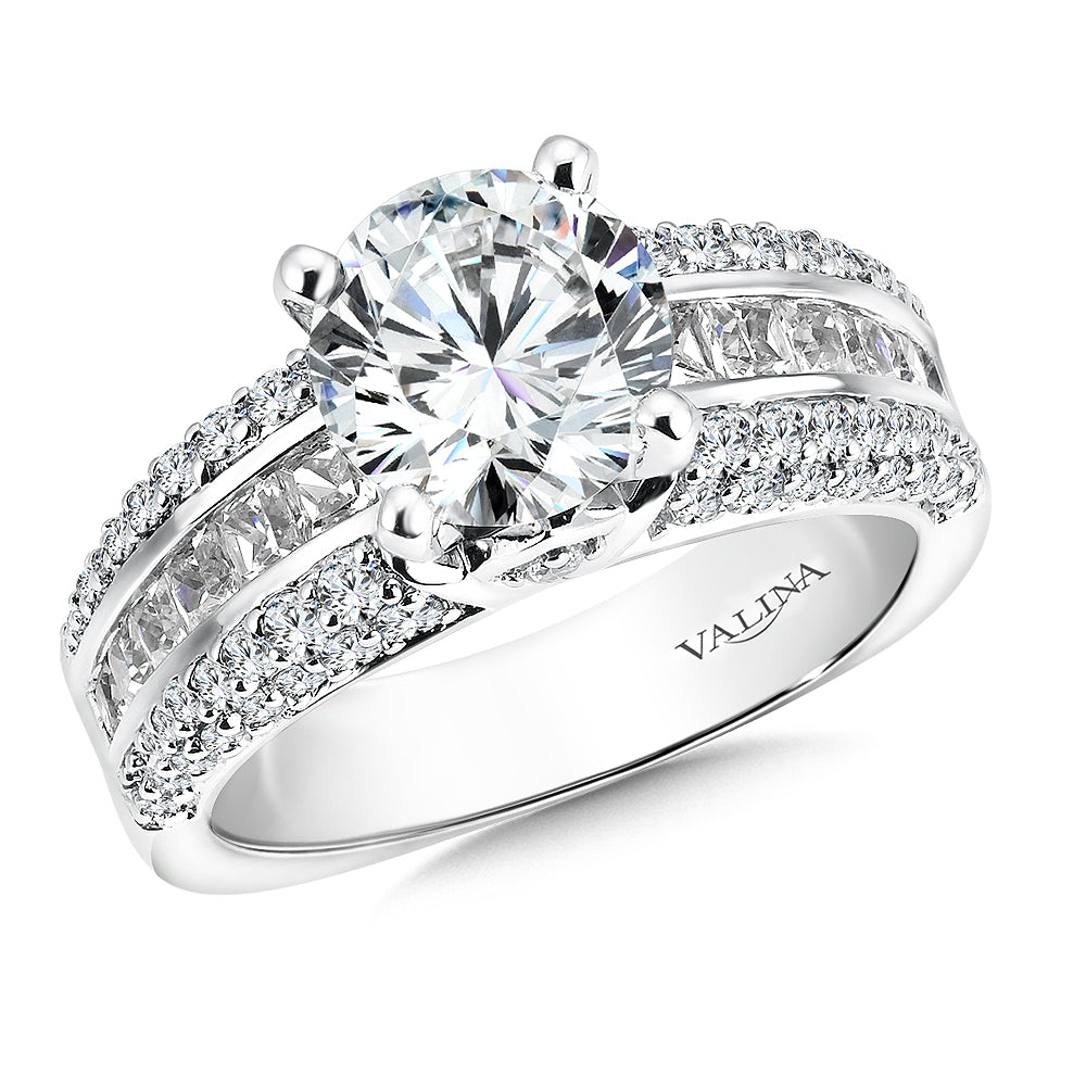 This 14K White Gold Channel and Pave-Set Diamond Engagement Ring is crafted to impress and designed to last a lifetime. The wide, heavy 14K white gold band is channel-set with Princess cut diamonds, bordered by two rows of rolled pave-set diamonds that lead to the majestic round center stone. A peek-a-boo diamond in the gallery adds extra sparkle to the overall beauty of the ring. The Euro-shank ensures comfort during daily wear and the ring can be paired with a stunning center stone of your choice. If you want to make a statement with a ring that refle carats your love and commitment, this engagement ring is the perfe carat choice.