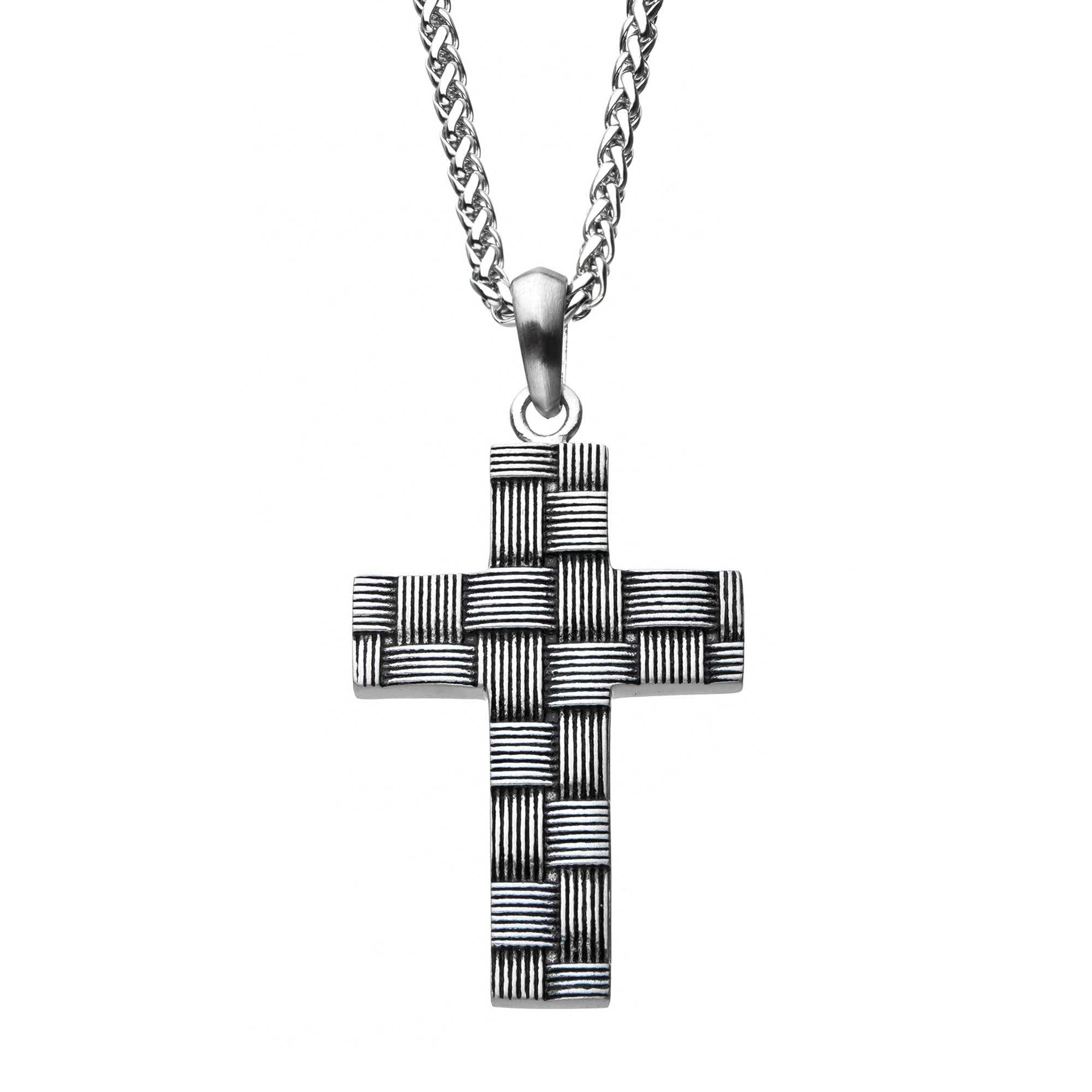 Antiqued Stainless Steel Weave Pattern Cross Pendant with Chain Necklace